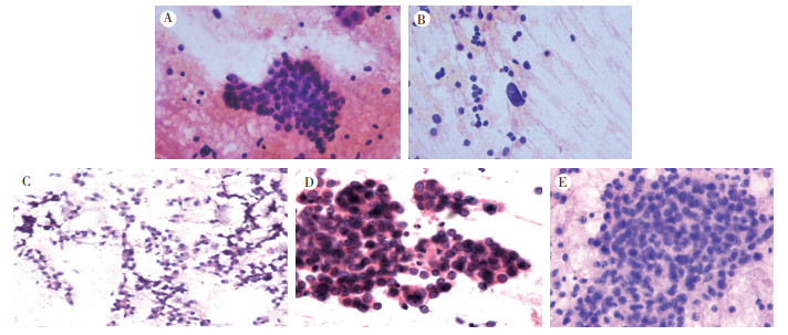 | 注 A:G1级PanNETs细胞学涂片显示细胞成团及散在分布(HE×400);B:G1级PanNETs细胞学涂片可见巨大的裸核细胞图(HE×400);C:G2级PanNETs细胞学涂片可见柱状上皮样细胞(HE×200);D:G2级PanNETs细胞学涂片显示细胞松散排列成团状(HE×400);E:G3级PanNETs细胞学涂片中细胞呈裸核样散在分布(HE×400) 图 1 胰腺神经内分泌肿瘤细胞学涂片 Fig.1 Cytological smears of pancreatic neuroendocrine tumors |