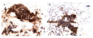 1.3 免疫细胞化学染色PanNETs的细胞学涂片的必选抗体为突触素(Synaptophysin,Syn)、嗜铬素A(Chromogranin,CgA)、Ki-67和CD56抗体;可选抗体为β-catenin、白细胞共同抗原(leukocyte common antigen,LCA)、CD56和抗胰蛋白酶(α-1-antichymotrysin,AACT)等,所用抗体及血清均购自福建迈新生物有限公司。本次观察的细胞学涂片,均染色封固后,显微镜下观察后褪色再行免疫细胞化学染色,可以将细胞涂片分成若干区进行不同抗体的染色。主要步骤:移去掉盖玻片(时间久可烤箱加热后去掉盖玻片),放入二甲苯内脱树胶至完全脱胶。梯度乙醇脱水后,1%盐酸乙醇溶液内褪色3 min,蒸馏水水洗3 min晾干备用。免疫细胞化学染色步骤:3%过氧化氢溶液15 min,蒸馏水水洗3 min,枸橼酸盐缓冲液高压修复1.5 min,冷却至室温,磷酸盐缓冲盐溶液(phosphate buffered saline,PBS)冲洗,羊血清封闭抗原37℃孵育15 min,弃掉多余血清后,滴加一抗4℃过夜或37℃室温2 h,PBS冲洗,滴加生物素标记二抗,常温孵育15~20 min,PBS冲洗3 min 3次,滴加二氨基联苯胺(3, 3, -diaminobenzidine,DAB)液显色,显微镜下观察显色适当后放入蒸馏水中终止反应,苏木精对比染色3 min,梯度乙醇脱水,中性树胶封固。