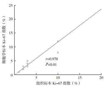 1.4 统计学分析采用SPSS19.0统计学软件进行数据分析。细胞学标本与术后组织标本中Ki-67水平分析采用Pearson积矩相关分析。以P < 0.05为差异具有统计学意义。