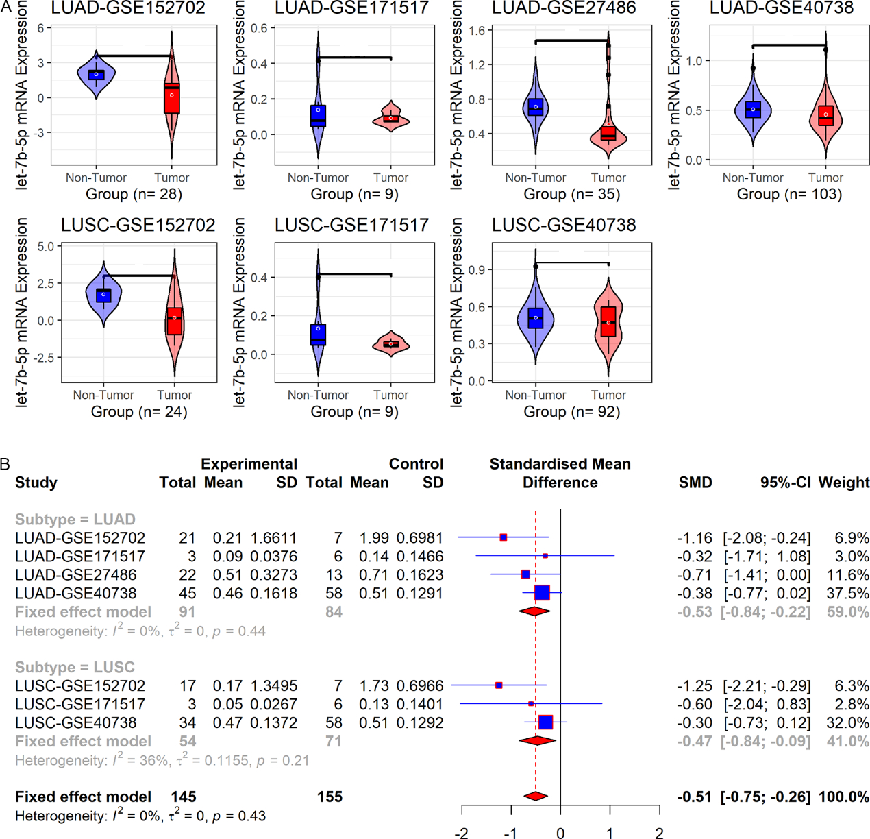 2 结果 2.1 NSCLC组和对照组let-7b-5p表达差异LUAD-GSE152702、LUAD-GSE27486以及LUAD-GSE40738数据集显示let-7b-5p在LUAD组的血液中表达低于对照组(均P < 0.05,图 1A)。LUSC-GSE152702数据集显示,与对照组比较,LUSC患者的血液中let-7b-5p表达更低(P < 0.05,图 1A)。进一步亚组分析显示,let-7b-5p在LUAD组(SMD=-0.53,95% CI: -0.84~-0.21)及LUSC组(SMD=-0.47,95% CI: -0.84~-0.09)血液中低表达(图 1B)。LUAD和LUSC汇总分析表明,let-7b-5p在NSCLC组血液中的表达水平较对照组低(SMD=-0.50,95% CI: -0.75~-0.26;图 1B)。