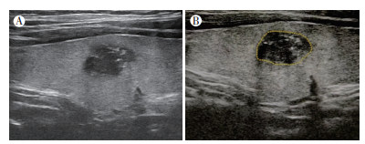 1.2 仪器与方法超声检查使用Acuson S2000(西门子医疗系统有限公司,德国)和ARIETTA 70(株式会社日立制作所,日本)超声诊断仪,选择浅表器官模式下频率为4~18 MHz的线阵探头。术前超声检查和超声图像的保留由1名工作经验 > 10年的超声科医师完成。嘱患者平卧位,头后仰,充分暴露颈前区,然后对甲状腺腺体进行整体常规扫查,对目标病灶行多切面探查。所有超声图像均需清晰显示结节声像图特征,可包括结节纵切面、横切面和斜切面。