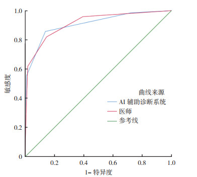 | 注 AI:人工智能(artificial intelligence) 图 2 AI辅助诊断系统与医师诊断甲状腺结节的ROC曲线比较 Fig.2 ROC curves of the AI assisted diagnosis system versus physician diagnosis for thyroid nodules |