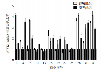 | 图 1 肺癌及癌旁组织中STYK1 mRNA水平检测 Fig.1 The mRNA level of STYK1 in lung cancer and paracancer tissues |