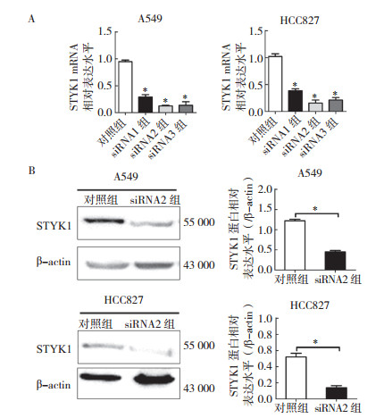 为研究STYK1在肺癌发展过程中的作用,合成3对靶向沉默STYK1基因的siRNA片段。结果发现,siRNA2对STYK1 mRNA的沉默效果最佳。在A549细胞中,其沉默效率高达(87.2±8.1)%;在HCC827细胞中,其沉默效率达(84.2±10.2)%(图 2A)。通过Western blot检测siRNA2对STYK1蛋白的沉默效果发现,siRNA2能够有效沉默STYK1蛋白表达水平。在A549细胞中,其沉默效率高达(73.0±2.6)%;在HCC827细胞中,其沉默效率高达(72.5±12.1)%(图 2B)。因此,后续实验采用siRNA2片段。