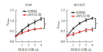 | 注 *P < 0.01 图 3 沉默STYK1抑制肺癌A549和HCC827细胞增殖 Fig.3 Knockdown of STYK1 inhibits the proliferation of lung cancer A549 and HCC827 cells |