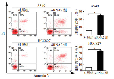 | 注 *P < 0.01 图 4 沉默STYK1促进肺癌A549和HCC827细胞凋亡 Fig.4 Knockdown of SYTK1 promotes the apoptosis of lung cancer A549 and HCC827 cells |
