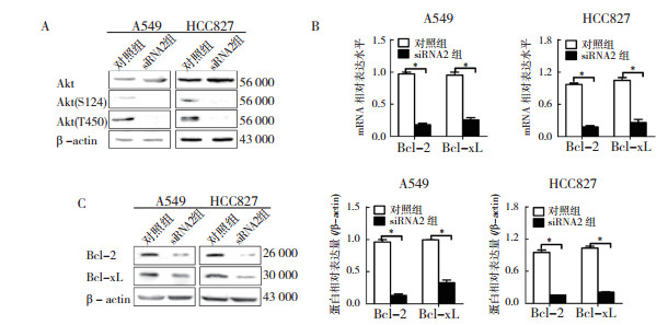 初步研究STYK1促进肺癌细胞增殖的作用机制发现,沉默STYK1后,Akt(S120)和Akt(T450)的磷酸化水平均降低,Bcl-2和Bcl-xL mRNA表达水平降低(图 5A~5B)。在A549细胞中,沉默STYK1后Bcl-2和Bcl-xL mRNA表达水平下降(81.4±2.5)%和(72.8±7.2)%。在HCC827细胞中,沉默STYK1后Bcl-2和Bcl-xL mRNA表达水平下降(81.3±2.9)%和(74.7±9.6)%。沉默STYK1后,Bcl-2和Bcl-xL蛋白水平均下调(图 5C)。在A549细胞中,沉默STYK1后,Bcl-2和Bcl-xL蛋白水平下降(86.5±4.4)%和(66.8±6.1)%。在HCC827细胞中,沉默STYK1后,Bcl-2和Bcl-xL蛋白水平下降(83.3±1.3)%和(79.4±2.1)%。