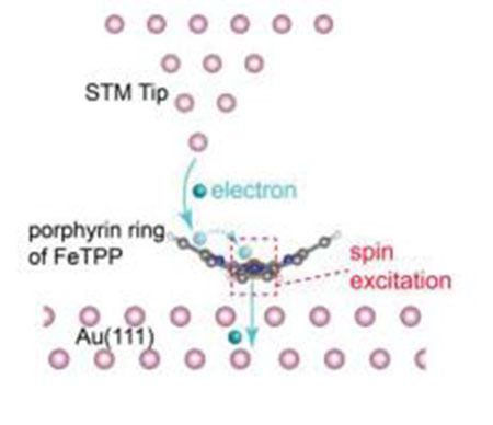 When the tip is placed above the high pyrrole group, the structure distortion of FeTPP on Au(111) makes electrons are inclined to transport through Fe and excite its spin states.