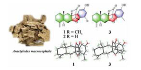 Three novel compounds were obtained from the rhizomes of Atractylodes macrocephala, which represented the first example of naturally occurring unusual hybrids constructed from eudesmanolide sesquiterpene and phenol, possessing pentacyclic 6/6/5/5/6 skeleton by formation of unprecedented C−C linkage. Compound 1 exhibited cytotoxicity against SGC-7901 cells by inducing cell apoptosis, which might relate to the promotion of synthesis of neutrophil elastase.