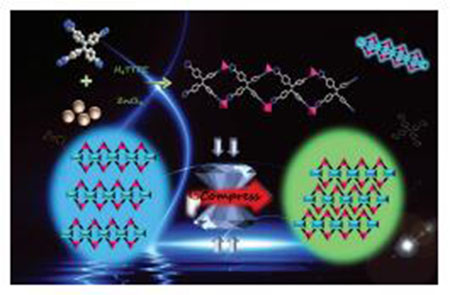 A highly emissive coordination polymer based on tetraphenylethylene-tetrazole chromophore was designed and synthesized. As expected, the resulting material exhibits excellent piezochromic luminescence behavior with the significant color change from blue to green accomplished with an enhanced efficiency change.