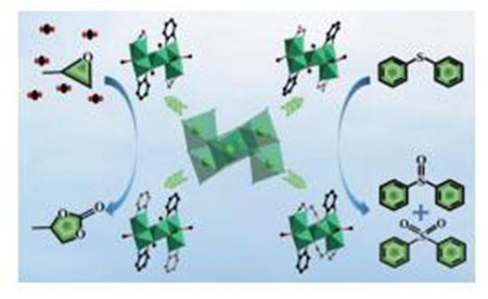 Four novel hexanuclear vanadium oxide clusters modified by dual ligand, V6-1-4, have been successfully prepared under solvothermal conditions. Their principal structure {V6} cluster is a brand-new Z-shaped configuration, which is different from other hexanuclear vanadium clusters. Meanwhile, the catalytic tests demonstrated that V6-1 as catalyst employs high catalytic activity in the cycloaddition reaction as expected. Additionally, V6-1 also exhibits high catalytic activity for the heterogeneous oxidative desulfurization of different sulfides.