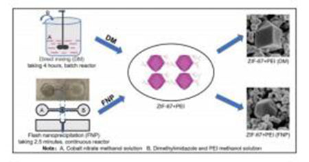 Compared with conventional direct mixing (DM) method, microchannel reactor flash nano precipitation method (FNP) can successfully synthesize the dodecahedron metal-organic frameworks ZIF-67 structure, and exhibit continuous process and superior efficiency.