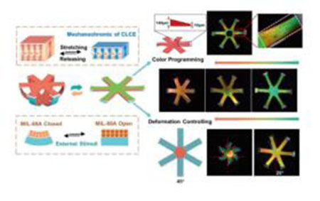 A simple and effective approach was proposed to prepare the multi-functional stimuli-responsive biomimetic devices with independently pre-programmable colorful visual patterns, complex geometries and morphable modes. The assembled artificial flower exhibits synergistic responses in shape and color by employing swellable metal organic framework (MOF)-based composite film to act as a rigidity actuation substrate and mechanically guide the spatial configuration of the soft chiral nematic liquid crystal elastomer (CLCE) sheet.