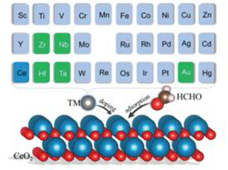 Investigation of the enhanced adsorption mechanism for formaldehyde on TM-doped CeO2 monolayer using density functional theory, TM-CeO2(100) (TM=Au, Hf, Nb, Ta, Zr) are screened as candidate materials to absorb formaldehyde.