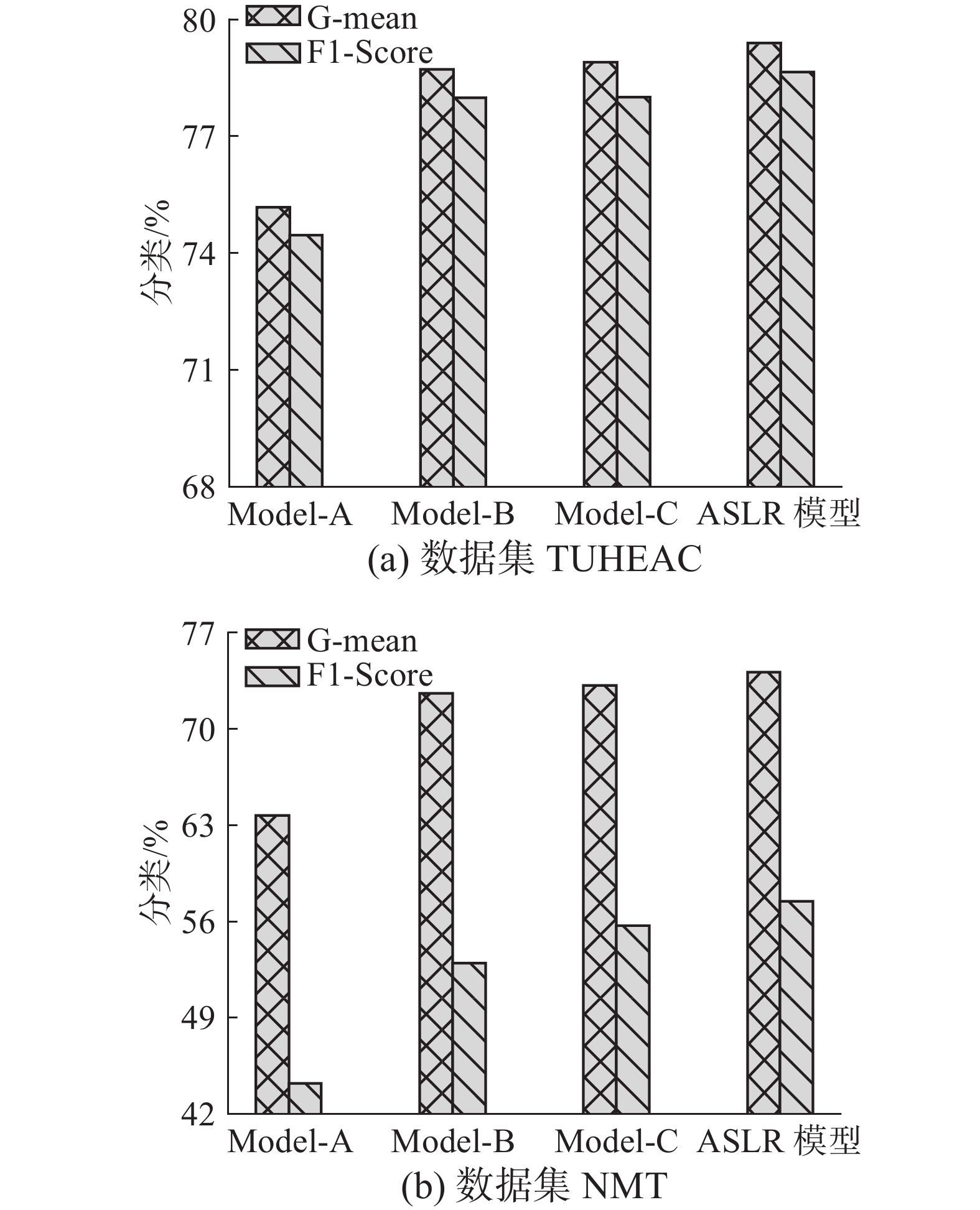 模型 TUHEAC NMT AveSN G-mean F1-Score AveSN G-mean F1-Score LLR 801.20±7.30 0.7517 ±0.0160 0.7446 ±0.0196 589.20±33.62 0.6371 ±0.0417 0.4423 ±0.0521 ENLR 736.20±12.08 0.7902 ±0.0200 0.7842 ±0.0247 627.40±22.91 0.5596 ±0.0601 0.4191 ±0.0746 SPR 515.80±8.16 0.7632 ±0.0206 0.7671 ±0.0177 710.00±26.40 0.2799 ±0.0471 0.4162 ±0.0383 ALCP 1121.00 ±15.970.7827 ±0.0188 0.7648 ±0.0236 663.00±46.57 0.7182 ±0.0289 0.5270 ±0.0421 ASLR 475.80±11.90 0.7940 ±0.0177 0.7865 ±0.0232 586.00±14.73 0.7413 ±0.0277 0.5749 ±0.0378 注:加粗数字表示最优结果。 表 4 多尺度特征融合方法在公共数据集上的消融实验结果