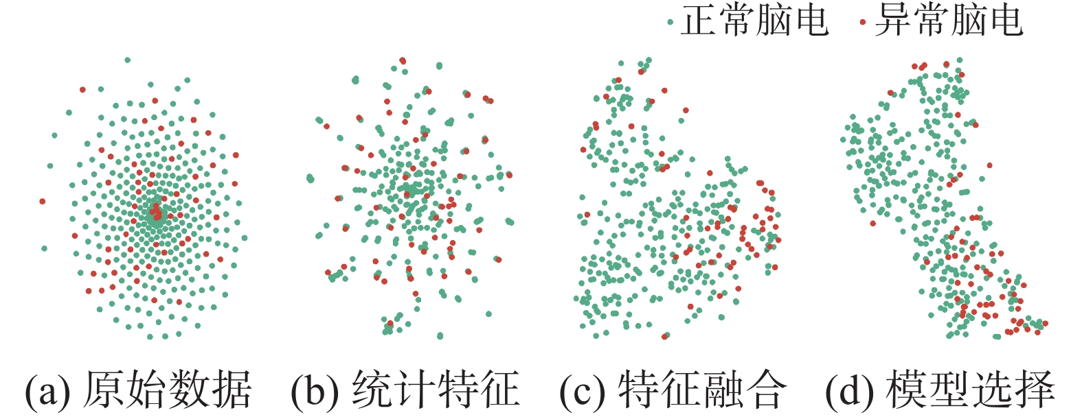 $ t $ -分布随机邻域嵌入($ t $ -distributed stochastic neighbor embedding,$ t $ -SNE)[33]来可视化新方法中每个核心部分输出的特征。图4和图5给出了新方法在测试数据集上不同阶段输出特征的可视化结果。由图4(a)和图5(a)可见,原始数据中不同类别间的特征被严重混淆,几乎无法有效辨识样本的类别标号,即样本数据近乎均匀分布。而观察图4(b)和图5(b)可以看出,经离散小波变换提取的脑电特征可以形成一定的聚类效果,不同类别之间的数据特征表现出差异性。有趣的是,小波统计特征经自适应聚合后,相同类别的特征具有抱团趋势,且不同类别样本的特征之间具有良好的区分性,如图4(c)所示。类似的结论在非平衡数据集NMT上也可以观察得到,如图5(c)所示。更有趣的是,我们发现,ASLR能够最终选取的数据特征具有更好的聚类效果,且分类边界也更加明显、清晰,如图5(d)所示。不同类别间的特征越易分割,则对其的分类效果就越好。因此,图4和图5给出的实验结果再一次验证了新方法能够通过多尺度特征融合和基于结构稀疏回归的特征选择来获得具有高度区分性的数据特征表示。此外,为了更好地理解新方法的性能,以TUHEAC数据集为例,将由ASLR模型学习得到的重要特征以脑地形图的方式进行可视化,如图6所示。从图中可以清楚地看出,患有脑部疾病的人群与正常人群的脑地形图具有显著差异。其中,患病人群的脑电特征值在部分大脑区域明显比正常对照组更大,特别是在额叶区域。有趣的是,这些发现与现有基于脑电信号的神经系统疾病研究相一致[34-36]。例如,癫痫发作波最常见于患者的额叶区域,而其他脑部区域尖峰放电的发生率小于10%[35]。这是因为额叶在认知与情感调节方面起着至关重要的作用。此外,从图6也可以观察到,在异常脑电组中,由于患者的脑功能紊乱导致不同导联上的平均特征值之间存在较大的差异性,这与Zhao等[37]的分析结果相一致。因此,以上实验结果从特征层面再次验证了ASLR模型是一种有效的异常脑电识别方法。