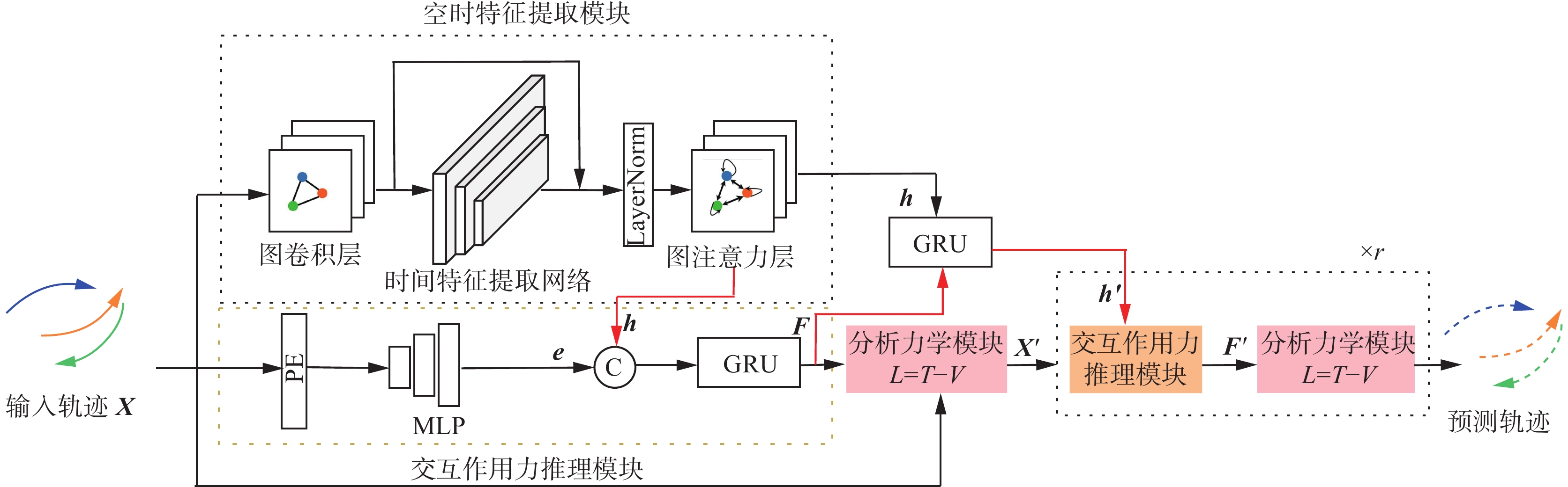 图2中右侧的分析力学模块是整个模型的核心计算单元,它结合目标初始状态(位置与速度)以及由前述模块推理出的交互力,计算系统的广义加速度,并更新预测轨迹。模块内部基于拉格朗日方程形式进行端到端优化学习,输出符合物理约束的预测结果,完成从时空特征提取到未来轨迹生成的闭环流程。通过式(11)得到交互作用力后,由式(7)分析力学计算加速度
