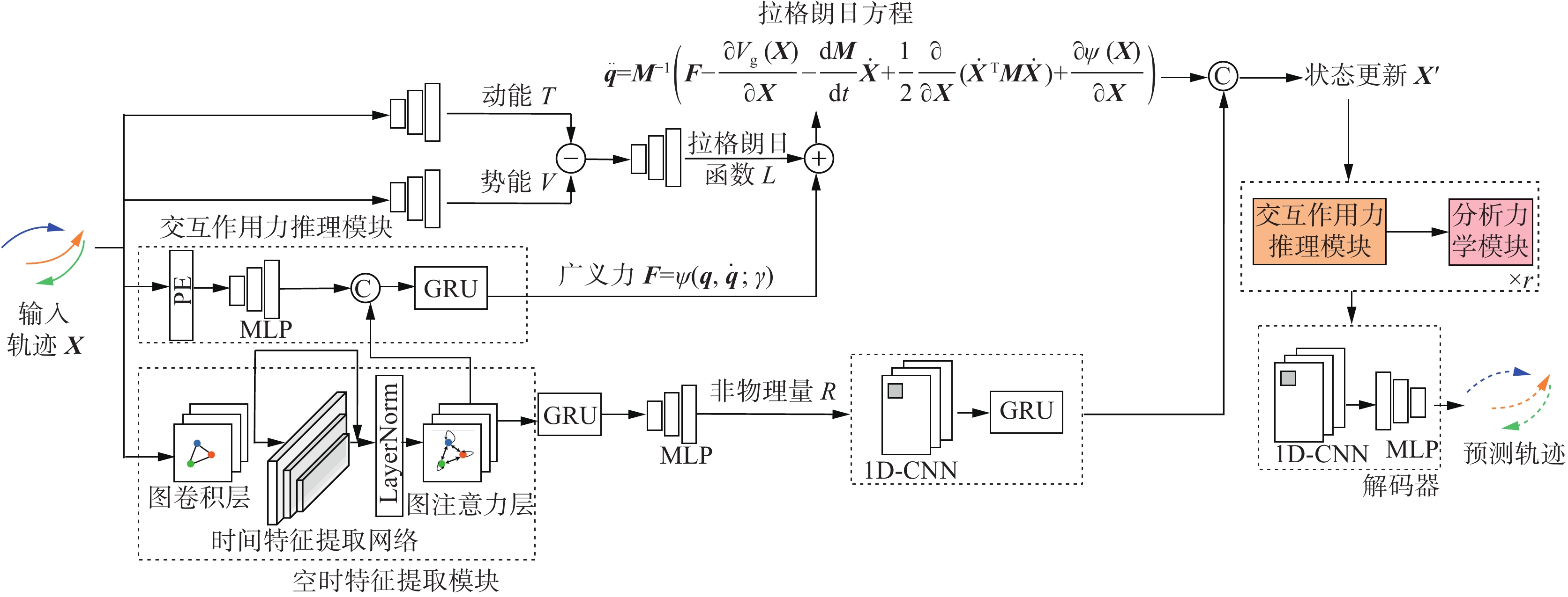 ${{\boldsymbol{e}}_i}_j$ 通过MLP学习节点之间空间上的约束和现实的交互情况,例如,对于行人轨迹预测,即使两个行人距离很近,通过计算两个行人运动方向的角度差,如果他们的行进方向不同,他们之间的交互可能相对较小。对于人体运动预测,当一个关节绕着另一个关节摆动时,关节之间的运动角度有一定的差值,但关节之间的距离始终为固定值,则会降低相连接关节之间交互关系权重。${{\boldsymbol{e}}_i}_j$ 通过位置编码确保模型能够理解数据的时间结构,不同时间节点之间距离和方向的变化会改变交互权重。2.4 基于分析力学的轨迹预测模块
