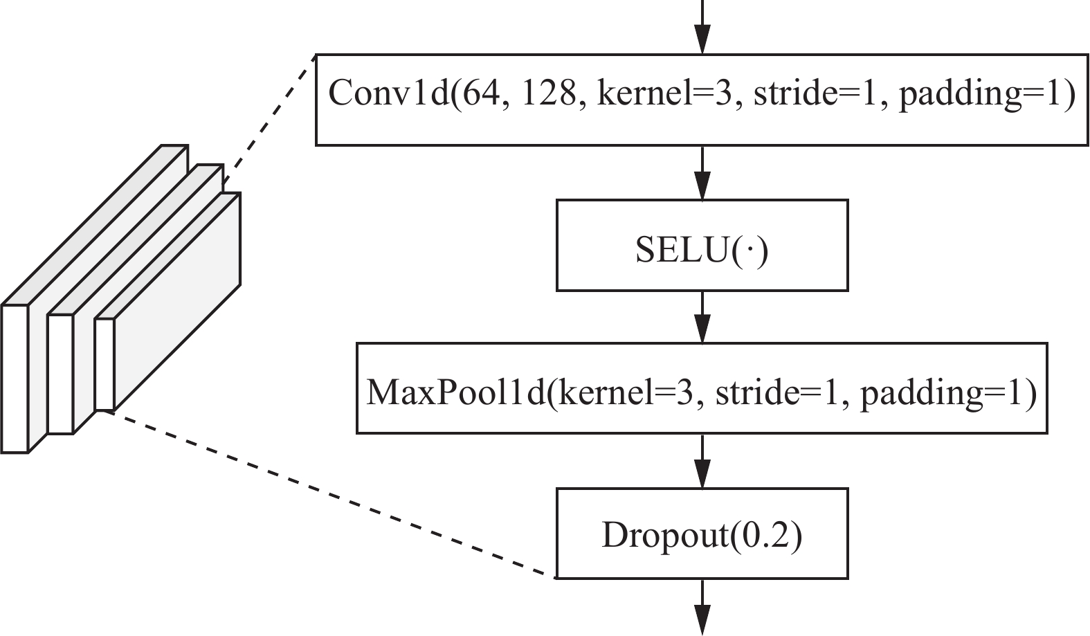 $ \hat {\boldsymbol{h}} =\left( {\hat h_1},{\hat h_2}, \cdots ,{\hat h_N}\right) $ 为更新后的特征向量,LN为层归一化(layer normalization)。时间特征提取网络TFN(temporal feature network),包括1D-CNN、SELU激活函数、最大池化层以及Dropout层,结构如图3所示。一维卷积网络通过在时间序列数据上滑动卷积核来提取特征,能够捕捉到数据中的时间依赖性和局部特征,可以帮助模型学习到如速度和加速度等动态变化的模式和规律。一维卷积网络中输入通道数为64,输出通道数为128,卷积核大小设置为3,卷积步长设置为1,使用大小为1的填充。相比使用RELU(rectified linear unit)激活函数,SELU激活函数具有自归一化特性,可以确保网络输出的均值和方差在训练过程中保持稳定,减轻梯度消失问题。最大池化层有助于模型在减少计算量的同时,保持对关键信息的敏感性。本文使用一维最大池化层,池化核大小设置为3,滑动步长设置为1,使用大小为1的填充。在式(8)中使用了残差连接来更有效地传递和利用空间特征,减少空间信息的丢失,同时能缓解梯度消失和梯度爆炸问题。在轨迹预测任务中,不同特征的尺度可能差异很大,层归一化可以消除这种影响,使得模型更加关注特征之间的相对关系,而不是绝对值。