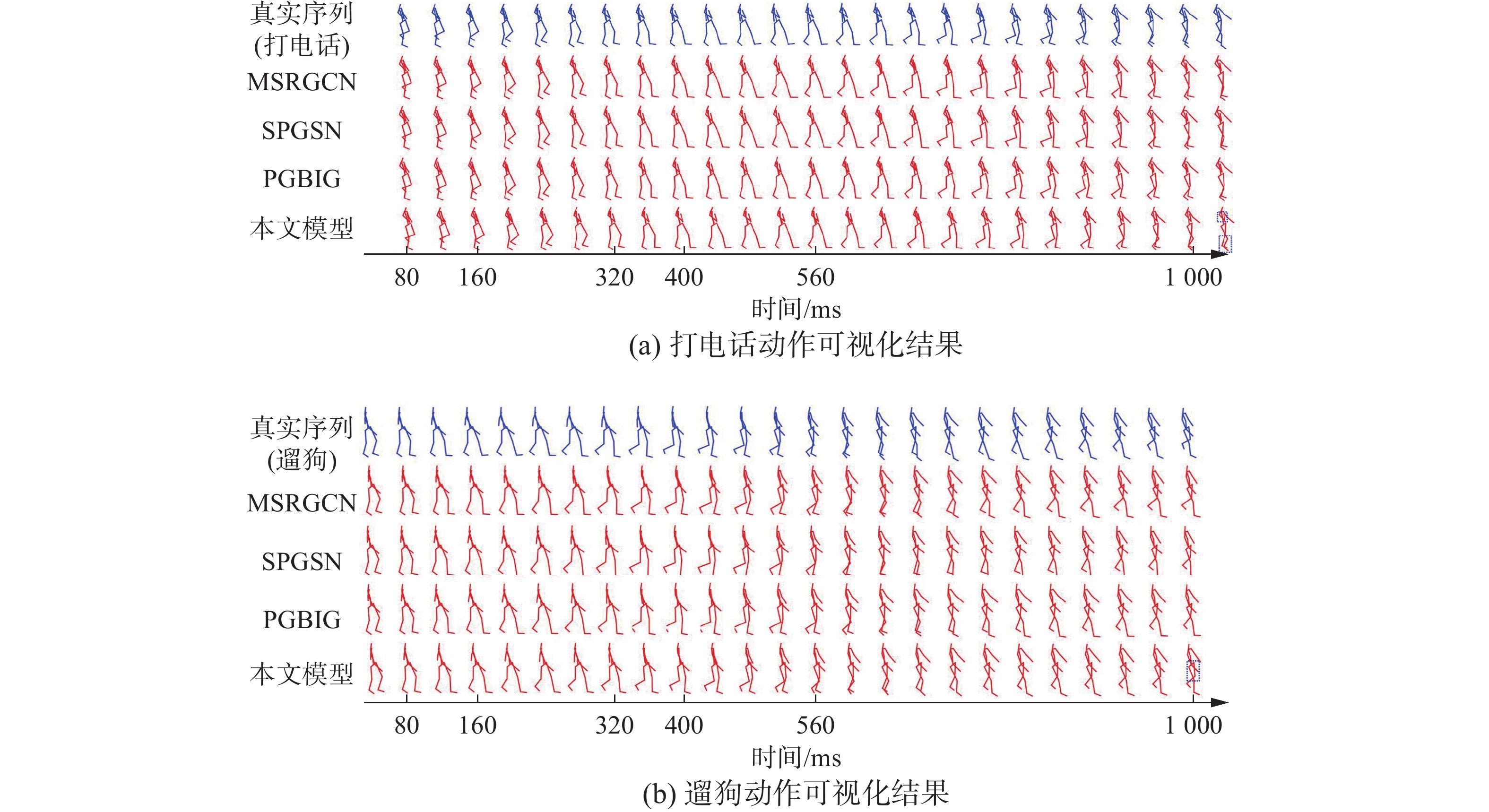 表 2 不同模型在数据集Human 3.6 Million上短期预测MPJPETable 2 MPJPE for short-term predictions of different models on Human 3.6 Million datasetmm 模型 打电话时间/ms 进食时间/ms 遛狗时间/ms 80 160 320 400 80 160 320 400 80 160 320 400 LTD[10] 10.2 21.0 42.5 52.3 8.4 16.9 33.2 40.7 23.4 46.2 83.5 96.0 MSRGCN[11] 10.1 20.7 41.5 51.3 8.4 17.1 33.0 40.7 20.7 42.9 80.4 93.3 SPGSN[12] 8.7 18.3 38.7 48.5 7.1 14.9 30.5 37.9 17.8 37.2 71.7 84.9 PGBIG[33] 8.3 18.3 38.7 48.4 7.0 15.1 30.6 38.1 18.8 39.3 73.7 86.4 本文模型 8.2 17.9 38.9 47.6 6.8 14.5 29.8 36.9 17.6 37.1 71.5 83.7 注:加粗表示本列最优结果。 表 3 不同模型在数据集Human 3.6 Million上长期预测MPJPETable 3 MPJPE for long-term predictions of different models on Human 3.6 Million dataset为了进一步验证模型性能,图5给出了打电话和遛狗动作的可视化预测结果,其中打电话代表运动模式较规律的动作类别,遛狗代表随机性较强的动作类别。每张子图第一行是真实动作序列,其余每行是不同模型的预测结果。从可视化结果中可以观察到,本文模型预测的未来姿态更接近真实序列,特别是在胳膊和腿上取得了更好的效果。例如在打电话动作中,本文模型在第