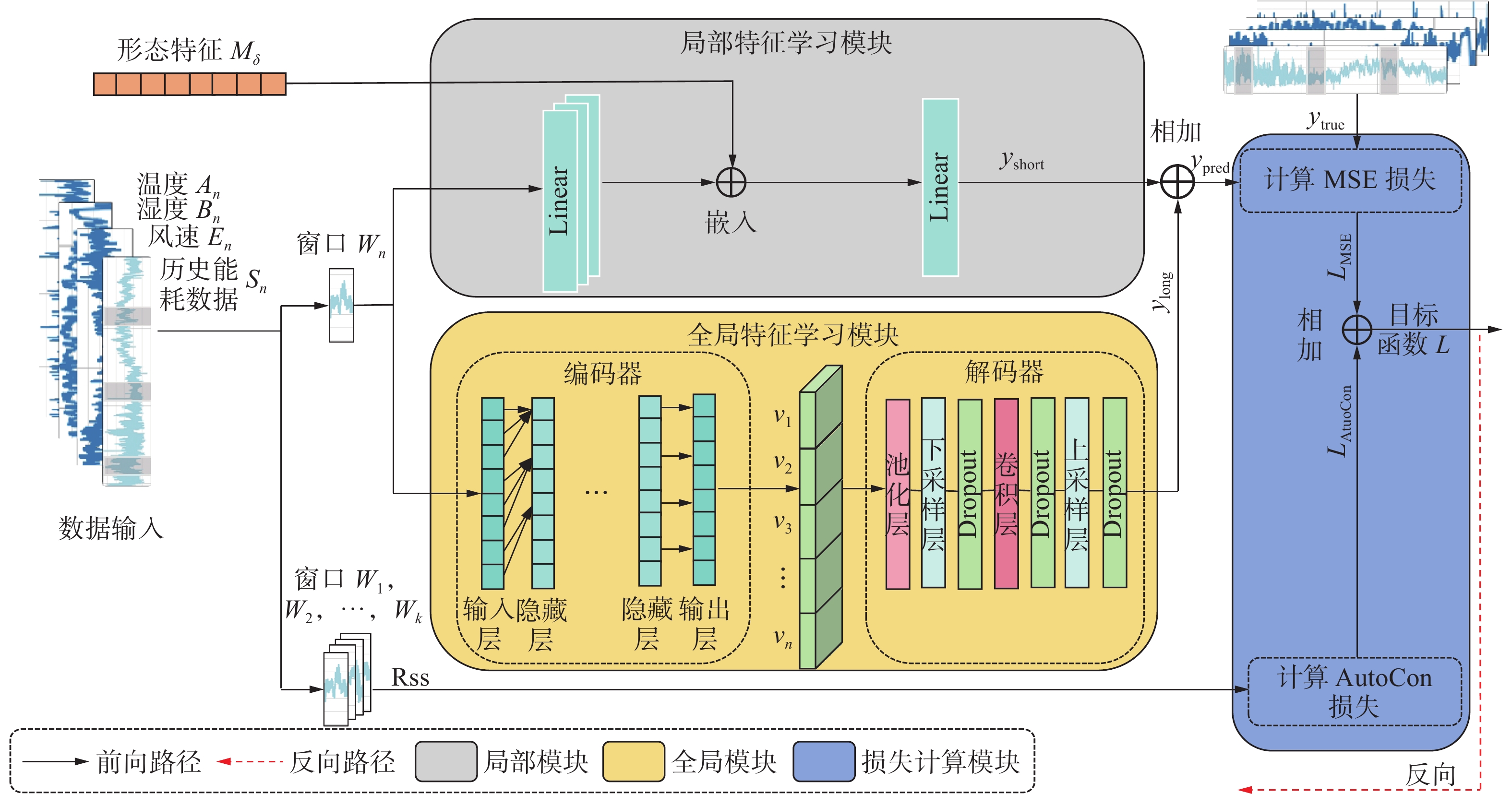 本文提出的基于时序相关性的建筑能耗预测方法(LG-TCL),主要包括局部特征学习模块、全局特征学习模块以及损失函数设计模块,整体框架如图1所示。
