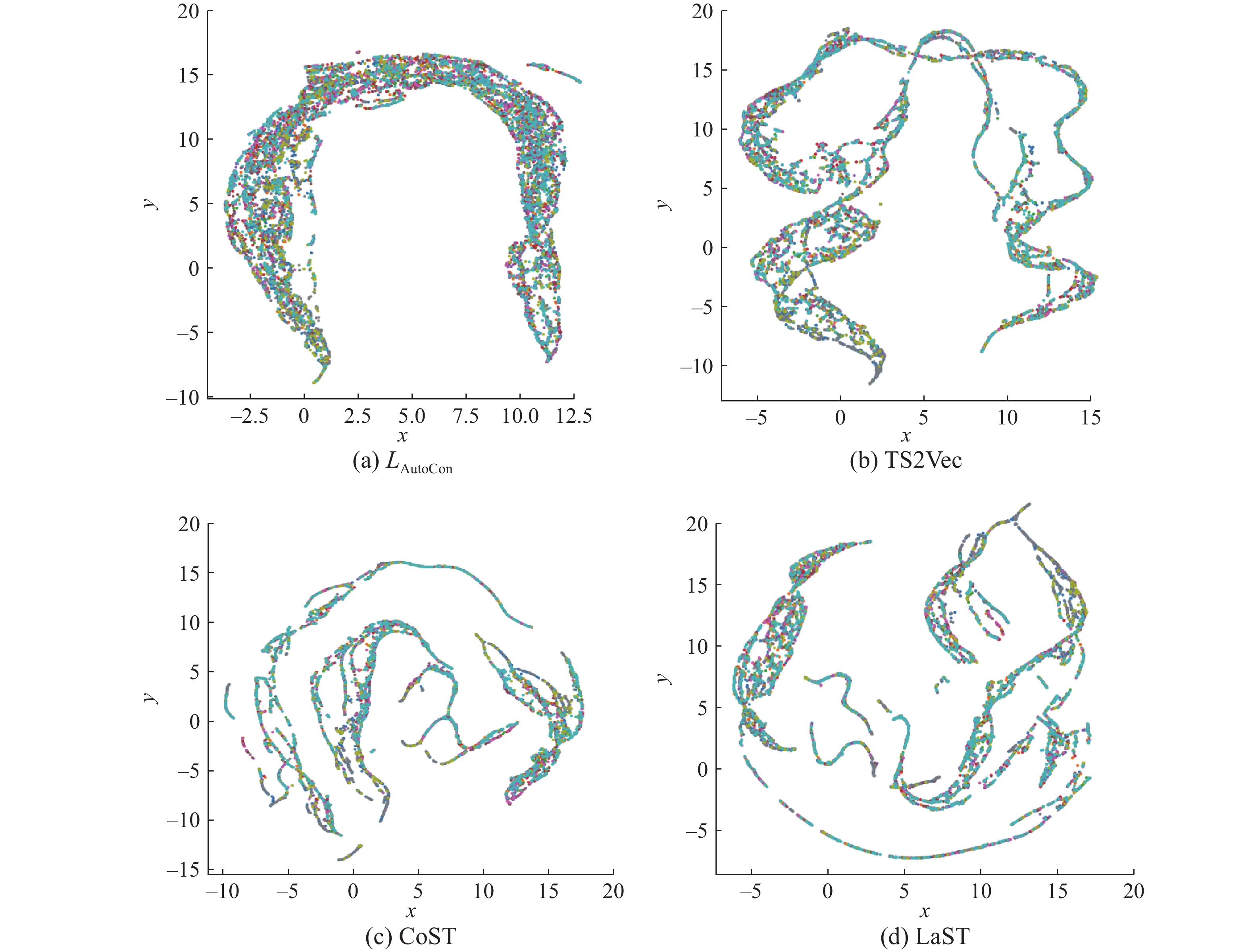 本文进一步将$ {L}_{\text{AutoCon}} $与TS2Vec[18]、CoST[19]、LaST[20]3种不同对比损失函数进行了对比,通过如图3所示的统一流形逼近与投影(uniform manifold approximation and projection,UMAP)图[31]直观给出。UMAP图表示的是经过降维后样本相对位置的抽象表示,代表了方法对时序数据变化趋势学习的能力。从图3可以看出,本文所采用的$ {L}_{\text{AutoCon}} $相较于其他3种自相关计算方式在时间轴上呈现连续带状分布,能清晰反映能耗从工作日到周末的渐变规律,而其他3种损失模块的数据点分散,在连续性上表现较差,这表明本文所采用的自相关计算方式能够较好学习长期趋势变化。