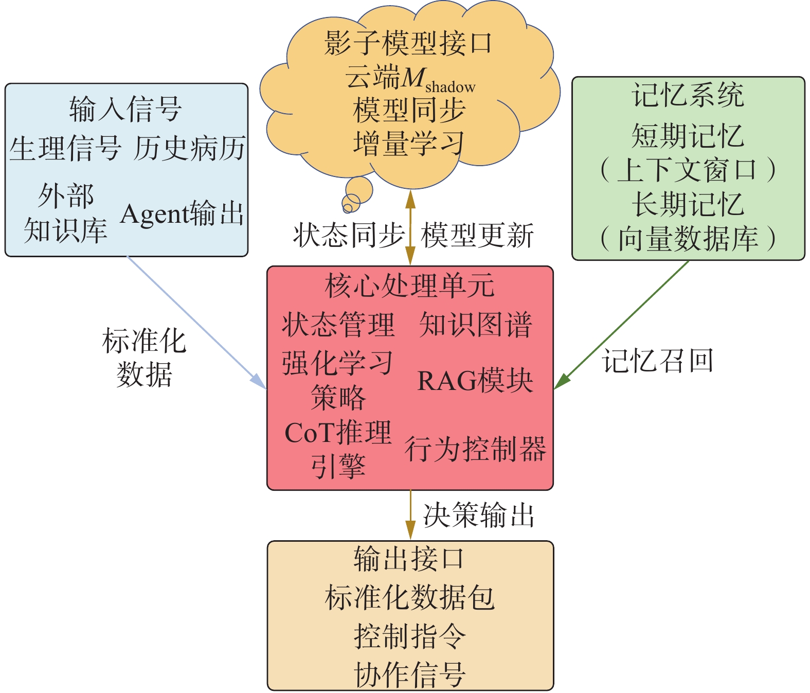 输入接口的设计目标是确保异构数据能够被 Agent 的核心处理单元有效利用;记忆模块通过短期和长期存储机制,使 Agent 能够理解当前情境并从历史经验中学习;核心处理单元是 Agent 执行智能任务的关键,其内部的各个模块协同工作,从状态维护到知识应用,再到最终的行为决策;输出接口保证 Agent 结果的有效传递。环境交互和影子模型交互接口则分别扩展 Agent 的物理交互能力和持续学习优化的途径。