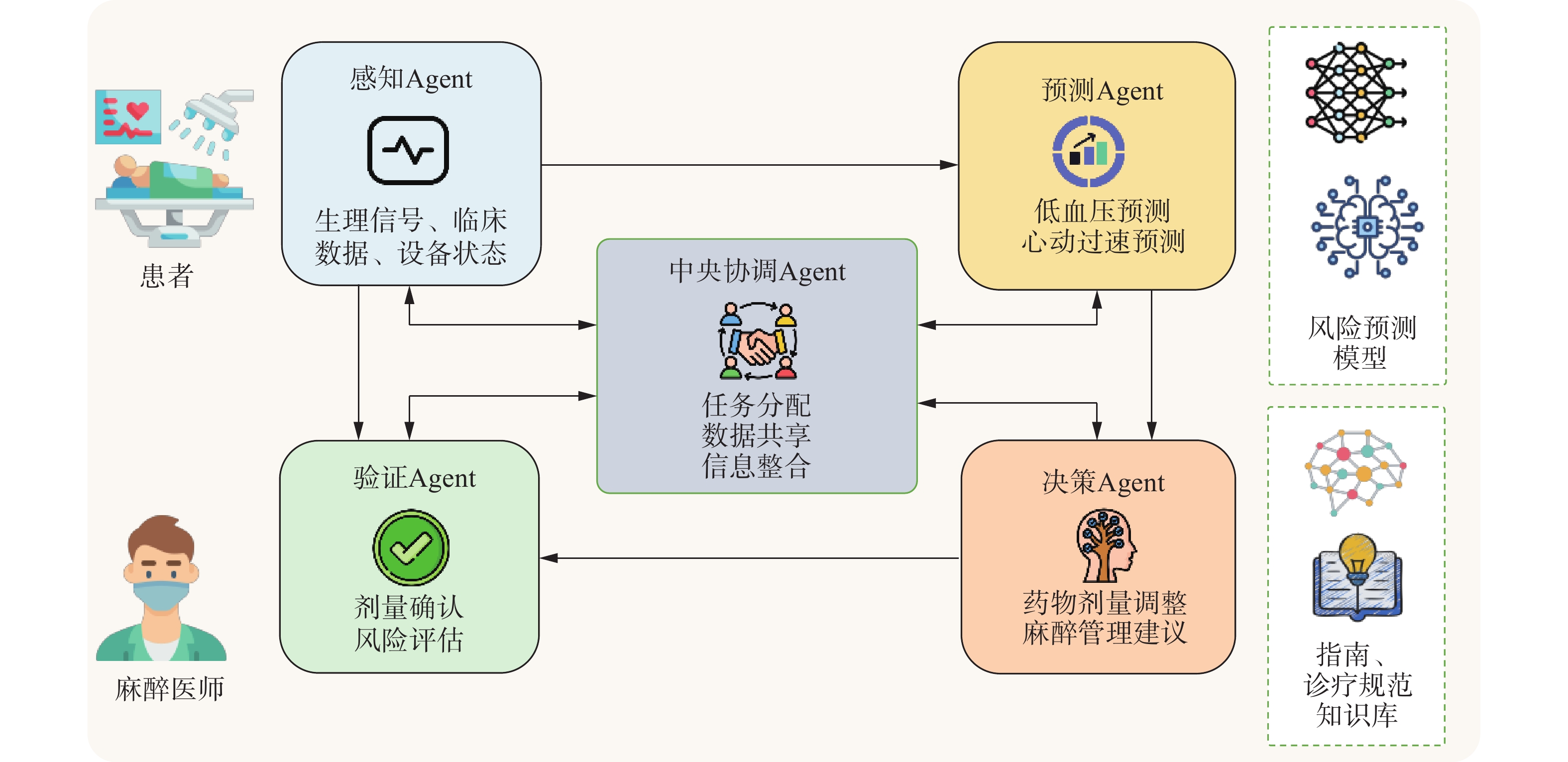 [1] ZENG Shiyue, QING Qi, XU Wei, et al. Personalized anesthesia and precision medicine: a comprehensive review of genetic factors, artificial intelligence, and patient-specific factors[J]. Frontiers in medicine, 2024, 11: 1365524. doi: 10.3389/fmed.2024.1365524 [2] CANNESSON M, ANI F, MYTHEN M M, et al. Anaesthesiology and perioperative medicine around the world: different names, same goals[J]. British journal of anaesthesia, 2015, 114(1): 8−9. doi: 10.1093/bja/aeu265 [3] SESSLER D I, MEYHOFF C S, ZIMMERMAN N M, et al. Period-dependent associations between hypotension during and for four days after noncardiac surgery and a composite of myocardial infarction and death: a substudy of the POISE-2 trial[J]. Anesthesiology, 2018, 128(2): 317−327. doi: 10.1097/ALN.0000000000001985 [4] FUTIER E, LEFRANT J Y, GUINOT P G, et al. Effect of individualized vs standard blood pressure management strategies on postoperative organ dysfunction among high-risk patients undergoing major surgery: a randomized clinical trial[J]. Journal of the American medical association, 2017, 318(14): 1346−1357. doi: 10.1001/jama.2017.14172 [5] NAIR B G, GABEL E, HOFER I, et al. Intraoperative clinical decision support for anesthesia: a narrative review of available systems[J]. Anesthesia & analgesia, 2017, 124(2): 603−617. [6] SHICKEL B, TIGHE P J, BIHORAC A, et al. Deep EHR: a survey of recent advances in deep learning techniques for electronic health record(EHR) analysis[J]. IEEE journal of biomedical and health informatics, 2018, 22(5): 1589−1604. doi: 10.1109/JBHI.2017.2767063 [7] SHORTLIFFE E H, SEPÚLVEDA M J. Clinical decision support in the era of artificial intelligence[J]. Journal of the American medical association, 2018, 320(21): 2199. doi: 10.1001/jama.2018.17163 [8] THIRUNAVUKARASU A J, TING D S J, ELANGOVAN K, et al. Large language models in medicine[J]. Nature medicine, 2023, 29(8): 1930−1940. doi: 10.1038/s41591-023-02448-8 [9] SAFDARI R, MALAK J S, MOHAMMADZADEH N, et al. A multi agent based approach for prehospital emergency management[J]. Bulletin of emergency and trauma, 2017, 5(3): 171−178. [10] 赵毅飞, 申乐, 叶佩军, 等. 平行麻醉: 从麻醉自动化走向智慧型全周期麻醉平台[J]. 智能科学与技术学报, 2024, 5(2): 234−246. ZHAO Yifei, SHEN Le, YE Peijun, et al. Parallel anesthesia: from anesthesia automation to intelligent full-cycle anesthesia platform[J]. Chinese journal of intelligent science and technology, 2023, 5(2): 234−246. [11] 王惠珍, 张捷, 俞怡, 等. 平行手术室: 围术期护理流程与智慧手术平台管理的新模式[J]. 模式识别与人工智能, 2023, 36(10): 867−876. doi: 10.16451/j.cnki.issn1003-6059.202310001 WANG Huizhen, ZHANG Jie, YU Yi, et al. Parallel operating rooms: a new model of perioperative nursing process and smart surgical platform management[J]. Pattern recognition and artificial intelligence, 2023, 36(10): 867−876. doi: 10.16451/j.cnki.issn1003-6059.202310001 [12] LIN Fei, GAO T, SUN Dali, et al. Parallel medical devices and instruments: integrating edge and cloud intelligence for smart treatment and health systems[J]. IEEE/CAA journal of automatica sinica, 2025, 12(4): 651−654. doi: 10.1109/JAS.2024.124614 [13] PATNAIK S. S, HOFFMANN U. Comparison of ChatGPT vs. Bard to anesthesia-related queries[EB/OL]. (2023−06−30)[2025−04−20]. https://www.medrxiv.org/content/10.1101/2023.06.29.23292057v1. [14] WANG Zhonghai, JIANG Jie, ZHAN Yibing, et al. Hypnos: a domain-specific large language model for anesthesiology[J]. Neurocomputing, 2025, 624: 129389. doi: 10.1016/j.neucom.2025.129389 [15] ZHOU Bohao, ZHAN Yibing, WANG Zhonghai, et al. Benchmarking medical LLMs on anesthesiology: a comprehensive dataset in Chinese[J]. IEEE transactions on emerging topics in computational intelligence, 2025, 9(4): 3057−3071. doi: 10.1109/TETCI.2024.3502465 [16] GUTHRIE E, LEVY D, DEL CARMEN G. The operating and anesthetic reference assistant(OARA): a fine-tuned large language model for resident teaching[J]. The American journal of surgery, 2024, 234: 28−34. doi: 10.1016/j.amjsurg.2024.02.016 [17] Anthropic. 2024. Introducing the Model Context Protocol[EB/OL]. (2024−11−25)[2025−04−06]. https://www.anthropic.com/news/model-context-protocol. [18] WEI J, WANG Xuezhi, SCHUURMANS D, et al. Chain-of-thought prompting elicits reasoning in large language models[EB/OL]. (2023−01−10)[2025−04−06]. https://arxiv.org/abs/2201.11903. [19] LEWIS P, ETHAN P, ALEKSANDRA P, et al. Retrieval-augmented generation for knowledge-intensive NLP tasks[EB/OL]. (2020−05−22)[2025−03−20]. https://arxiv.org/abs/2005.11401. [20] YANG Jing, TIAN Yonglin, LIN Fei, et al. From RAG to ARG: agent reinforced generation for agentic intelligence[J]. The international journal of intelligent control and systems, 2025, 30(1): 76−82. [21] ZHANG Jiayi, XIANG Jinyu, YU Zhaoyang, et al. AFlow: automating agentic workflow generation[EB/OL]. (2025−04−15)[2025−06−15]. https://arxiv.org/abs/2410.10762. [22] CONNOR C W. Artificial intelligence and machine learning in anesthesiology[J]. Anesthesiology, 2019, 131(6): 1346−1359. doi: 10.1097/ALN.0000000000002694 [23] JOHN DOYLE D, DAHABA A A, LEMANACH Y. Advances in anesthesia technology are improving patient care, but many challenges remain[J]. BMC anesthesiology, 2018, 18(1): 39. doi: 10.1186/s12871-018-0504-x [24] HASHIMOTO D A, WITKOWSKI E, GAO Lei, et al. Artificial intelligence in anesthesiology[J]. Anesthesiology, 2020, 132(2): 379−394. doi: 10.1097/ALN.0000000000002960 [25] SCHMIERER T, LI Tianning, LI Yan. Harnessing machine learning for EEG signal analysis: innovations in depth of anaesthesia assessment[J]. Artificial intelligence in medicine, 2024, 151: 102869. doi: 10.1016/j.artmed.2024.102869 [26] HASHEMI S, YOUSEFZADEH Z, ALI ABIN A, et al. Machine learning-guided anesthesiology: a review of recent advances and clinical applications[J]. Journal of cellular & mole