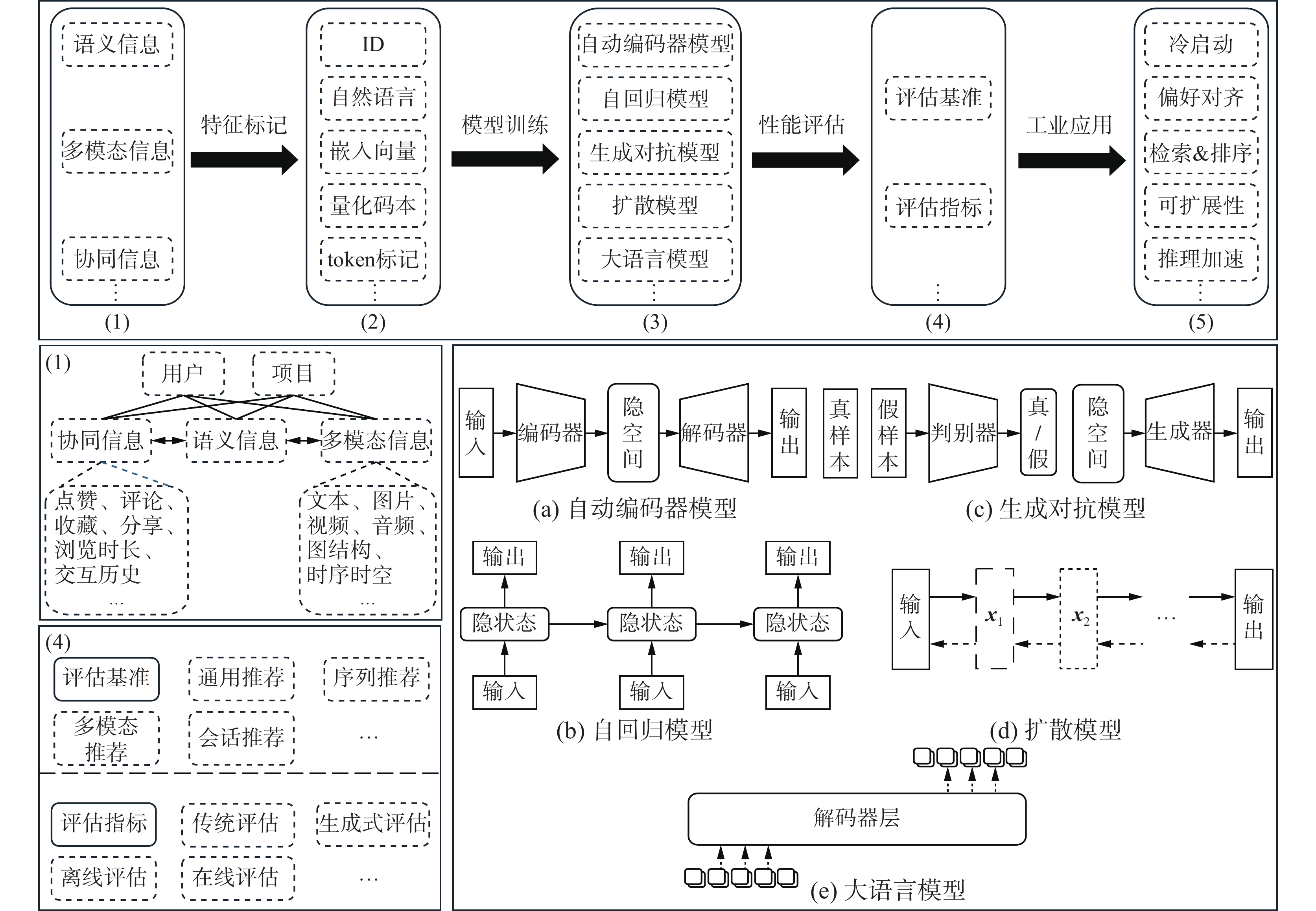 随着传统生成式模型和LLM技术的不断发展与完善,生成式推荐系统研究呈现出多元化和创新性的特点。现有部分文献[1-7]总结了LLM与推荐系统结合的主要方式,但其只局限在讨论LLM中的推荐方法。目前有相关的研究工作[8-9]总结了生成式推荐与传统推荐在范式上的区别,涵盖了LLM以外的生成式方法在推荐系统中的结合实现,但其只简要讨论了推荐系统中应用的生成模型。Huang等[10]总结了基于基础模型的推荐方法及其下游任务,吴国栋等[11]总结了LLM在个性化推荐中的主要研究。然而,目前的研究对生成式推荐领域的整体流程总结和深入分析仍然不足。针对这一研究缺口,本文聚焦于生成式推荐系统,查阅了近10年来的发展现状,按照特征标记、模型训练、性能评估和工业应用4个阶段系统梳理关键技术路线,并深入探讨当前面临的主要挑战与未来发展方向。旨在为该领域研究者提供一个全面把握生成式推荐整体结构和前沿进展的理论框架,促进生成式推荐系统在学术研究和工业应用中的创新与突破。总的来说,本文梳理了生成式推荐系统的特征标记方法,从语义描述、向量量化、残差量化和LLM标记4个主要的研究方向进行概述。针对生成式推荐系统的主要模型架构,重点分类综述了5种主流的生成式模型在推荐系统中的应用。此外,本文介绍了生成式推荐系统的主要评估方式,包括评估基准和评估指标。最后,本文对生成式推荐系统的主要应用场景进行概述,并探讨了当前的挑战和未来的研究方向。