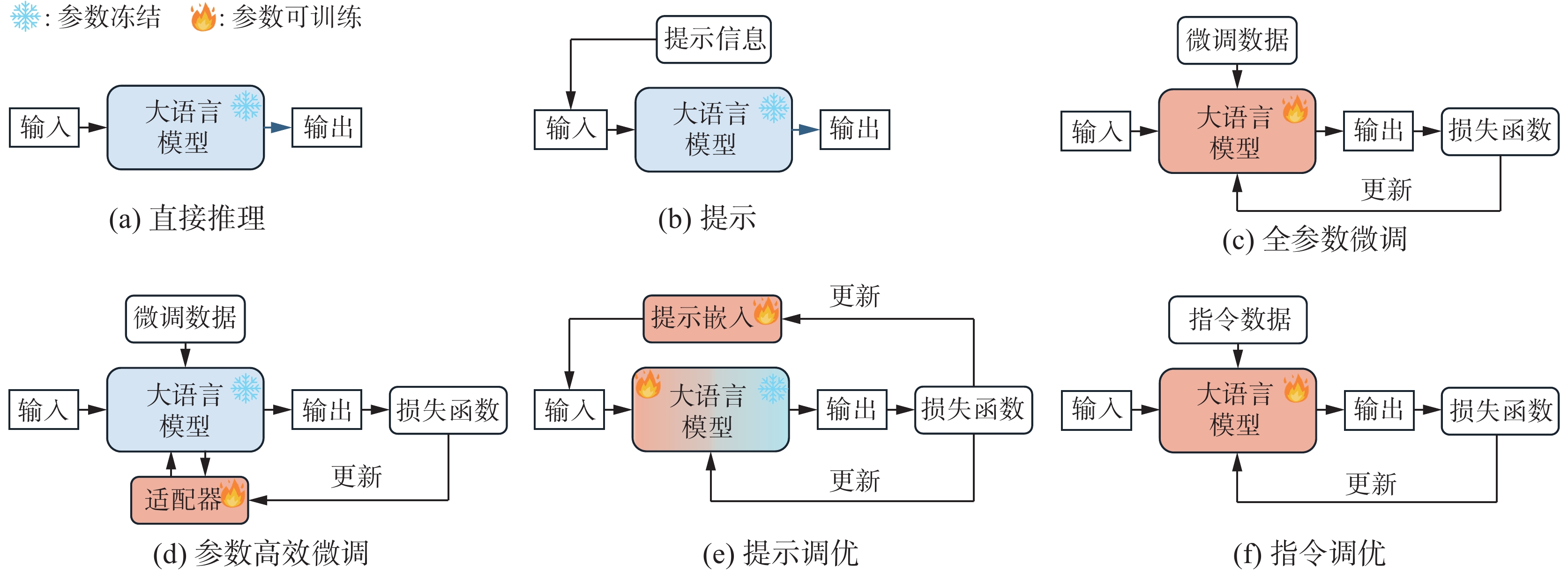 提示(Prompting)是指冻结LLM的预训练参数,通过人工设计或规则生成的提示词模板显式引导模型在下游任务中的生成能力。根据提示内容的不同,可以分为普通提示词、上下文学习(in-context learning,ICL)和思维链(chain-of-thought,CoT)3种提示方式。