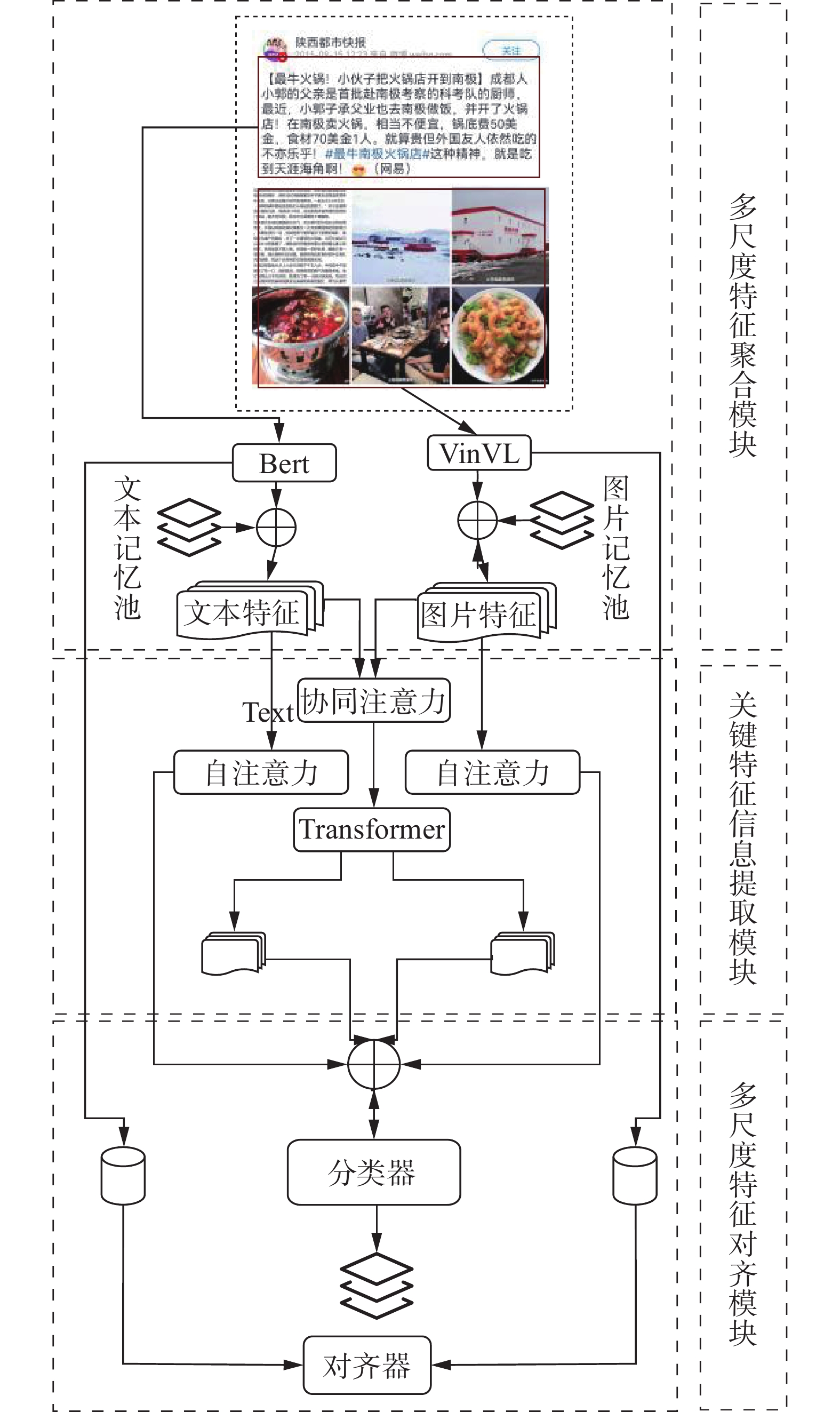 现有的多模态检测模型[6-7]通常利用独立的视觉编码器和文本编码器分别提取图像和文本的全局特征[8],随后在整体层面上进行特征融合[9]。然而,这种粗尺度的融合方式往往忽视了模态内部的局部细节信息,导致细尺度特征的利用率不足,难以准确捕捉决定新闻真实性的关键线索[10-11]。例如,在虚假新闻检测场景中,图像中的特定局部区域如修改过的痕迹[12]、重要的图标信息或文本中的关键短语如夸张性的表述[13]、与图片矛盾信息的词语往往对检测结果具有重要的决定性作用,但这些细尺度特征在现有模型的全局特征融合过程中容易被忽略[14-15]。
