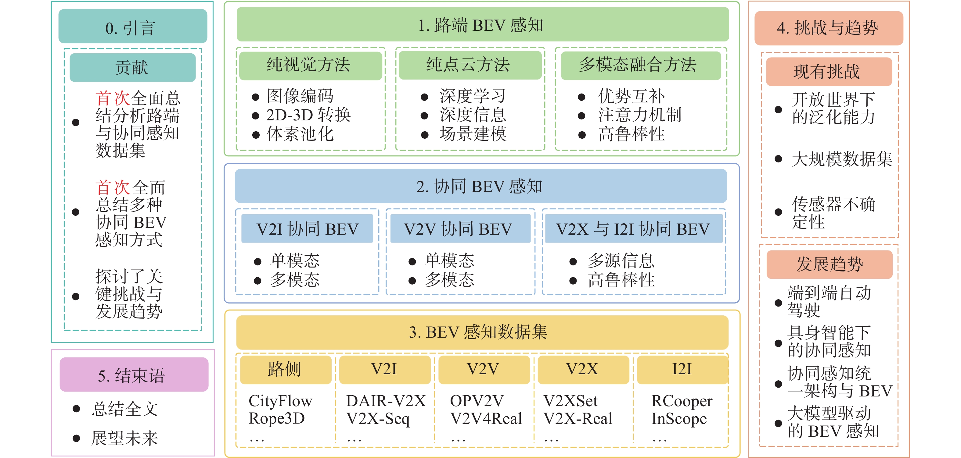 基于上述分析,本文提出了一种兼具系统性与扩展性的 BEV 感知综述框架,旨在弥补现有研究在感知部署与模态融合两个维度上的不足。具体而言,本文从“感知部署位置(路端、车路两端)”与“感知模态(图像、点云、融合)”两个维度出发,首次构建了覆盖 BEV 感知主流技术路径的多维度、多模态技术框架。在此基础上,本文系统梳理了路侧及车路协同感知相关的真实与仿真数据集,涵盖其传感器配置、任务类型与标注形式,为后续研究奠定良好基础。同时,本文还聚焦 BEV 感知系统在开放类别识别、大规模无监督数据学习、传感器不确定性等现实挑战,并展望其在端到端闭环系统、具身智能、大模型驱动协同感知等方向的演进趋势。本文的主要贡献包括: