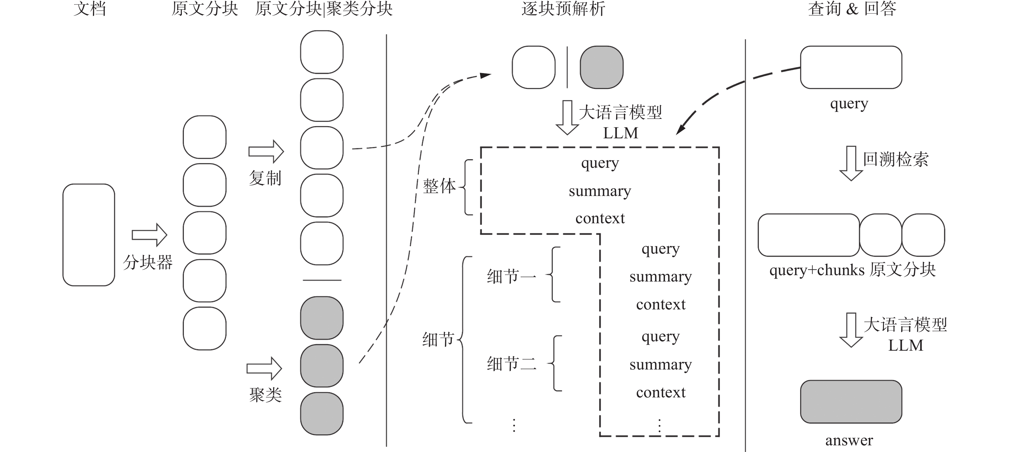 CAP-RAG在检索时能够同时兼顾不连续的多跳知识和大文本分块内的局部细节信息,其模型结构如图1所示,主要包括3个部分:1)聚类重组:通过聚类算法对原文分块聚类以得到新的包含不连续知识的新分块;2)预解析:通过提示工程对各个分块生成兼顾分块原文和分块内细节的三元组(query, summary, context),其中,query表示查询,summary表示总结,context表示原文或对原文的部分引用,从而构建出大量预解析分块;3)检索与生成:将召回的所有分块均还原为原文分块,避免预解析环节模型幻觉带来的影响,然后连同查询语句一同输入给大语言模型以得到最终答案。