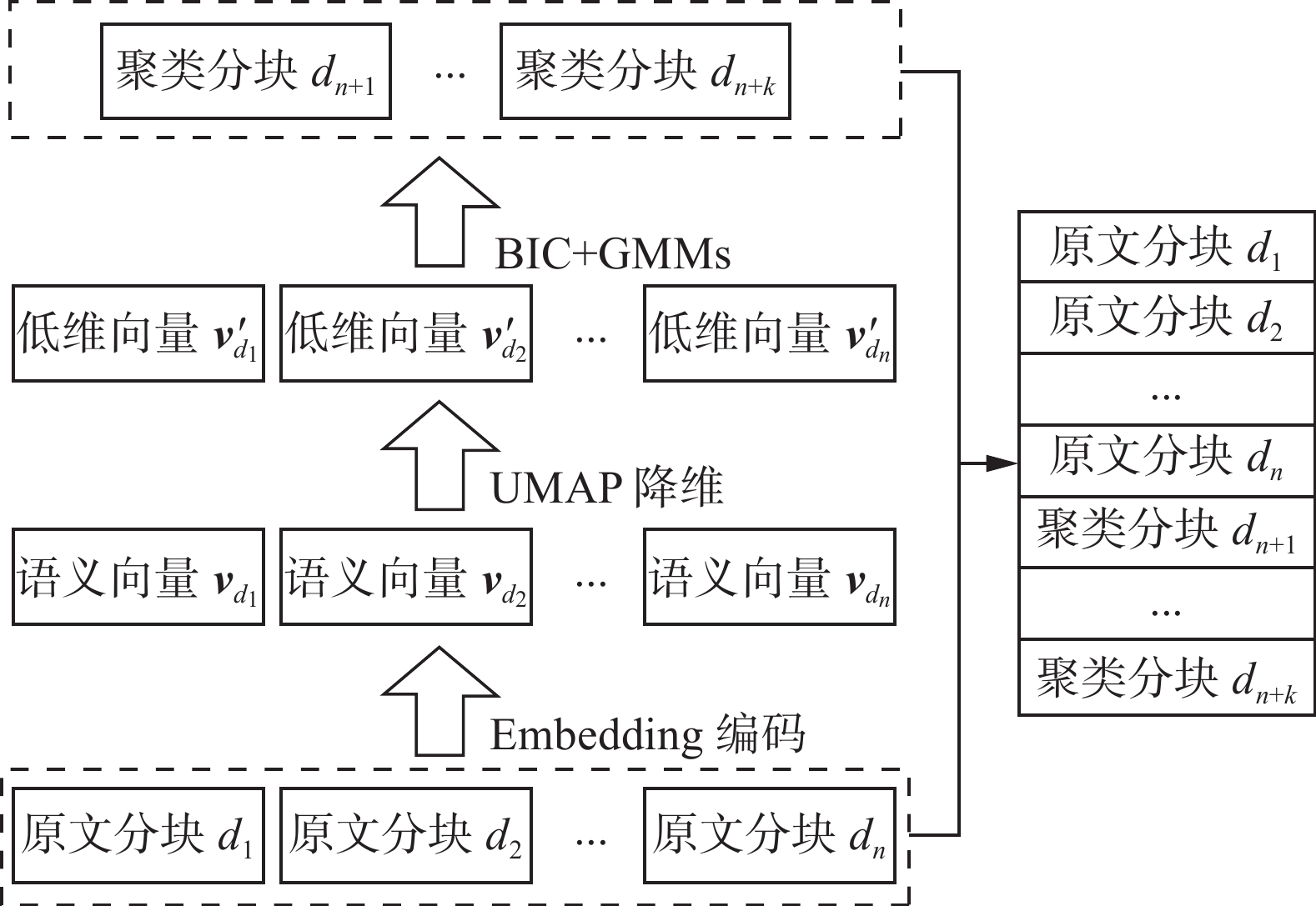 为了能同时采样不连续的上下文信息,本文在语义空间上使用聚类算法对语义相似的原文分块进行重组,基本过程如图2所示。索引阶段利用Embedding模型对所有原文分块向量化得到$ {\boldsymbol{v}}_{{d}} $后,首先使用统一流形近似与投影(uniform manifold approximation and projection, UMAP)算法[29]对$ {\boldsymbol{v}}_{{d}} $降维得到$ {{{\boldsymbol{v}}}}_{{d}}^{\prime} $;然后利用贝叶斯信息准则(Bayesian information criterion, BIC)对$ {{{\boldsymbol{v}}}}_{{d}}^{\prime} $预测聚类的个数$ k $;最后使用高斯混合模型(Gaussian mixture models, GMMs)对$ {{{\boldsymbol{v}}}}_{{d}}^{\prime} $聚类得到$ k $个聚类分组,即$ k $个聚类分块$ {d}_{n+1},{d}_{n+2},\cdots ,{d}_{n+k} $。上述过程可以表示为
