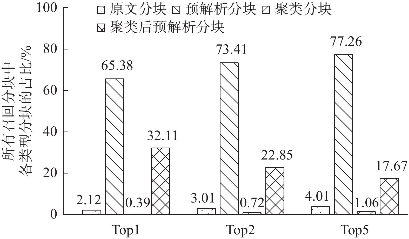 此外,为了进一步确认聚类分块、预解析分块是否在检索中发挥了作用,针对检索结果中各个分块的类型进行了统计分析,分析结果如图3所示。由于CAP-RAG检索的候选集里同时包含了“聚类分块方法”和“预解析分块方法”得到的文本分块,所以直接使用CAP-RAG方法,可以针对召回Top1、Top2和Top5个分块的情况分别统计出召回分块的类型分布(只统计正确的样本)。图3中的“预解析分块”是针对原文分块应用预解析方法得到的文本分块,而“聚类后预解析分块”表示针对聚类分块上应用预解析方法得到的文本分块。从图3中可以看出,基于预解析算法得到的“预解析分块”和“聚类后预解析分块”分别相比于“原文分块”和“聚类分块”有明显更高的占比,在Top1、Top2和Top5这3种召回条件下,“预解析分块”的占比分别为65.38%、73.41%和77.26%,而“聚类后预解析分块”的占比分别为32.11%、22.85%和17.67%,说明预解析算法确实提高了聚类分块和原文分块的召回率,充分说明了预解析算法的有效性;此外,由于检索阶段召回的“聚类分块”和“聚类后预解析分块”实质上都先被回溯为聚类分块,之后再进一步被回溯为原文分块,因此检索召回的各个分块也可以按照是否源自聚类分块划分为两类,其中源自聚类分块的分块数量在Top1、Top2、Top5这3种召回条件下分别有32.50%、23.57%、18.73%的占比,同样验证了聚类算法的作用。