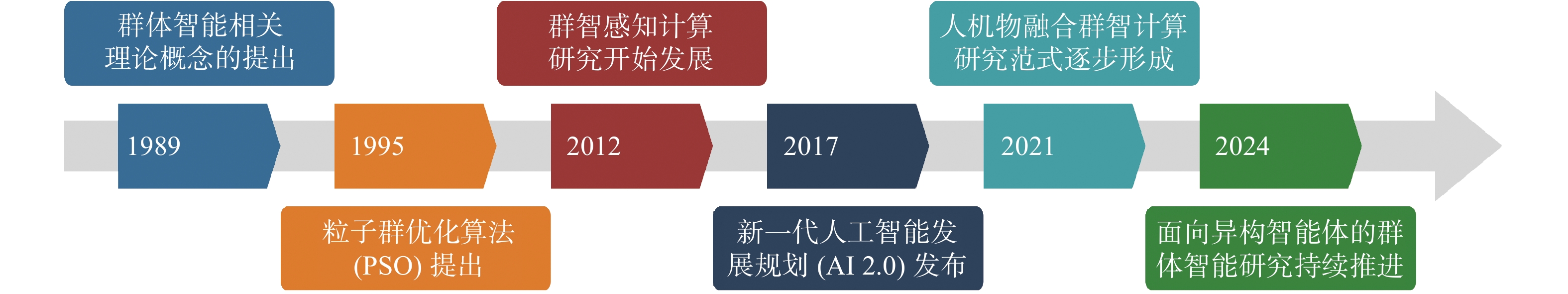 综上,群体智能正通过跨学科融合不断拓展其理论边界与应用空间,以CrowdHMI 为代表的协同范式,在异构智能体组织、分布式感知与自主演化等方面展现出强大潜力,已成为新一代智能系统发展的重要方向之一,其技术演进路径如图1所示。