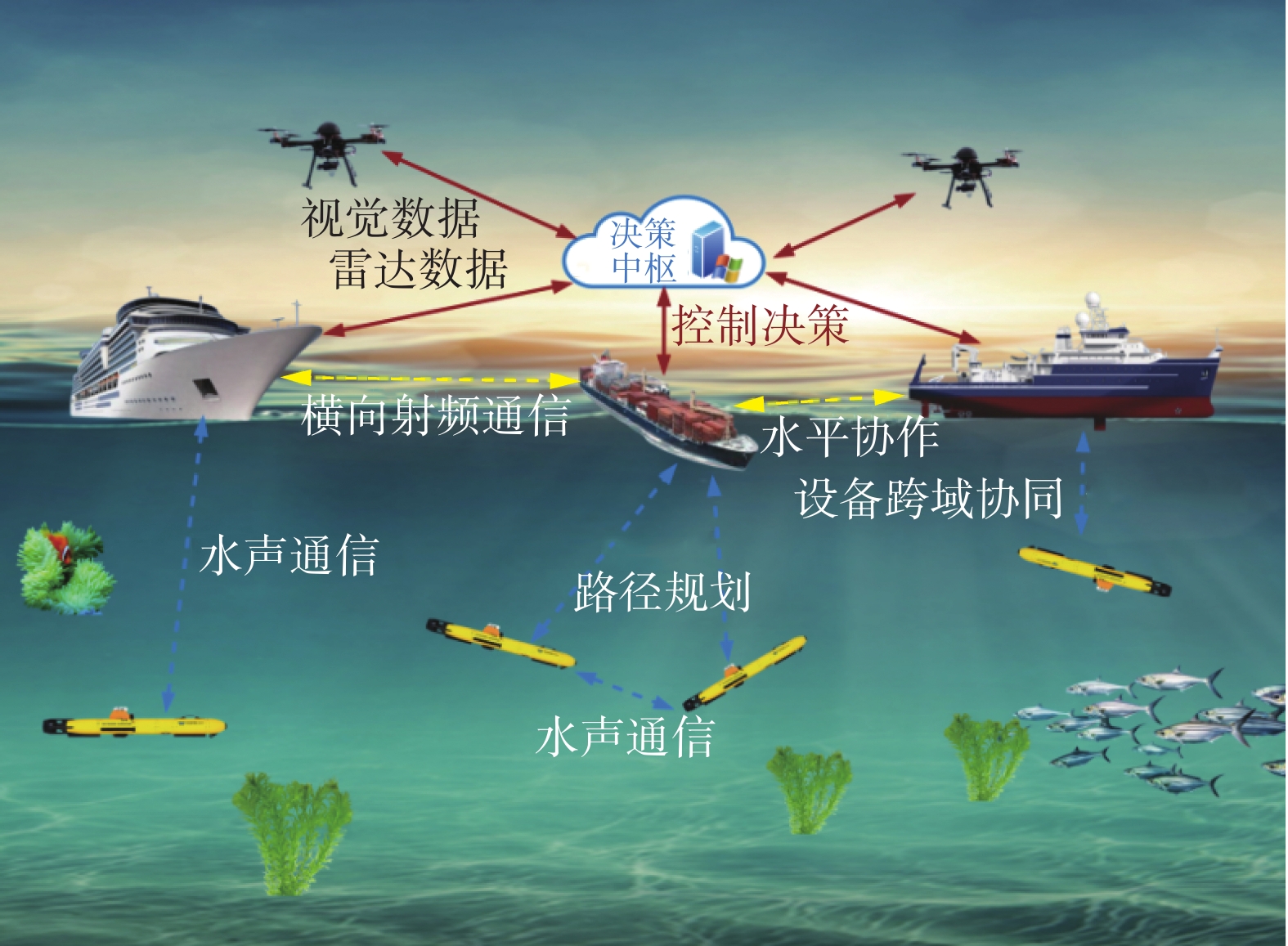 随着水下作业场景的日益复杂化,如海洋牧场监测和海底管道巡检,传统的单一集群已无法满足需求。因此,构建空−海−潜跨介质协同的异构智能系统成为关键。该领域面临三大核心科学问题:1)异构模态数据的统一理解,2)非对称资源约束下的动态调度,3)人类先验知识与机器自主性的融合。图4给出了一个用于执行复杂任务的跨域异构集群智能决策的示意图。