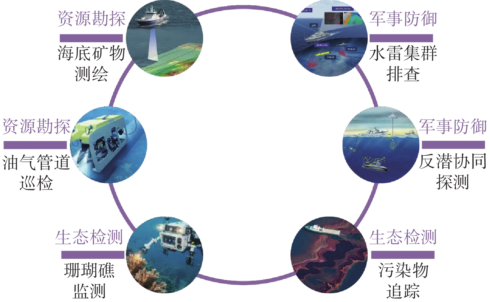 水下群体智能技术已在多类典型任务场景中得到应用,其代表性的应用形态与任务类型如图5所示,主要涵盖海洋资源勘探、水下环境监测与污染评估以及安防与军事侦察等方向。