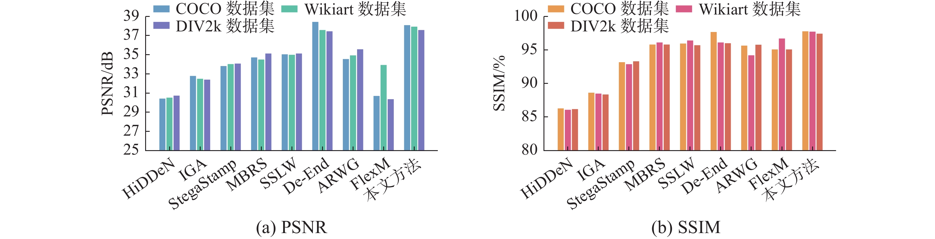 更高的PSNR和SSIM值意味着含水印图像具有更优秀的视觉质量,嵌入的信息也更难被察觉。具体的视觉质量对比如图3所示。如图4所示,本模型在3个数据集上的平均PSNR值和平均SSIM值均有提升。此外,如表1所示,本模型在30名志愿者参与的MOS主观评估中获得了最高分。实验结果表明,本方法对图像的视觉影响整体更小,达到了最佳的视觉质量。