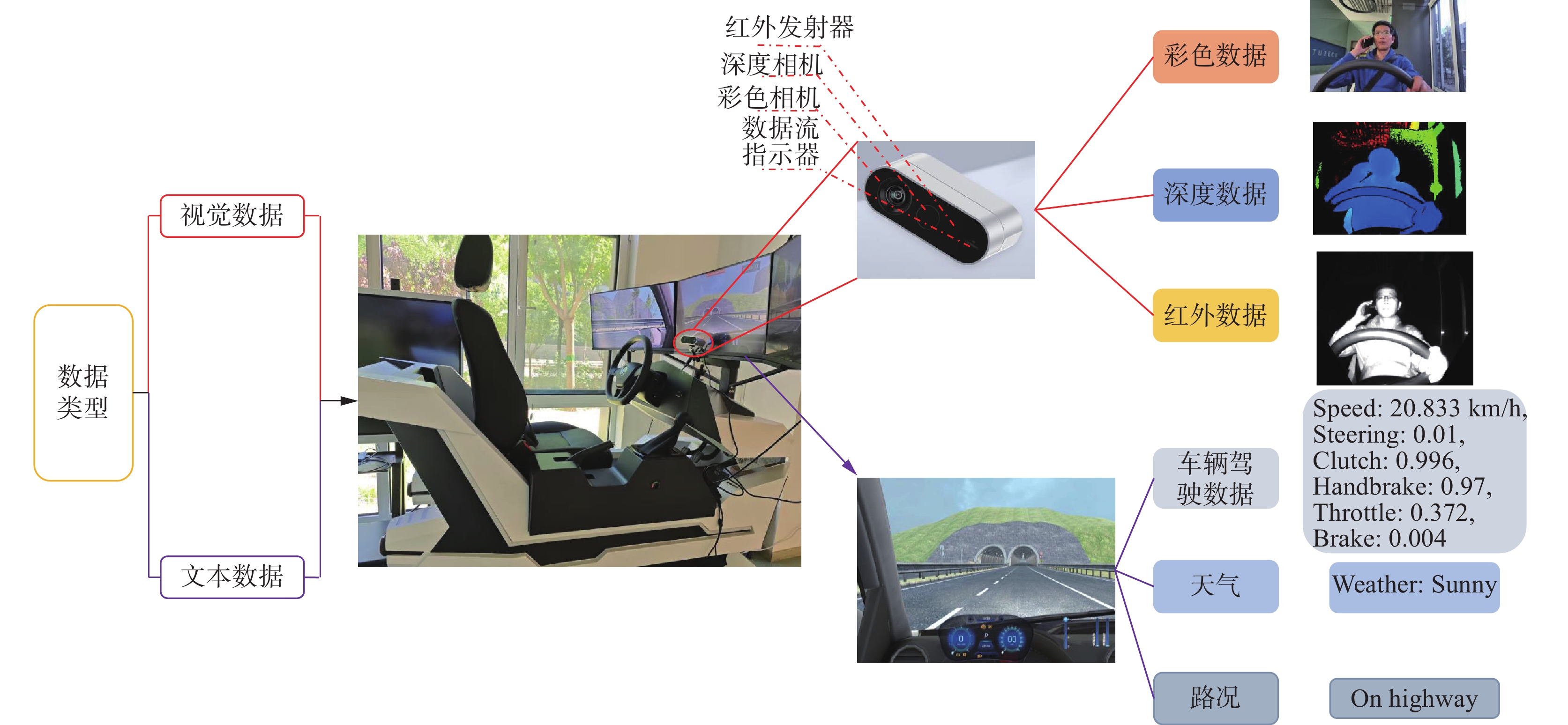 在车内场景中,智能座舱作为下一代人车交互的核心载体,其功能已从单一的行车信息显示演进为融合驾驶员状态感知与个性化服务推荐的主动式交互系统。尽管车内智能座舱技术近年来发展迅速,但其数据集的规模和多样性仍远落后于车外场景。以往数据集主要以彩色数据的形式呈现,缺乏深度数据与红外数据对任务的补充信息。Drive&Act[23]数据集通过集成彩色、深度和红外数据,提升了对驾驶员个体行为识别的建模能力,在一定程度上克服了视觉模态单一的问题。但该数据集聚焦于自动驾驶场景,且缺乏对车辆运行状态数据的采集与建模。随后发布的DMD数据集[24] 包含37名驾驶员的面部、身体与手部的多模态视频数据,更侧重于驾驶员注意力与行为状态识别,但同样未涵盖车辆动力学信息。通过分析现有相关数据集的不足(如表1所示),本文提出并构建了一个包含3类视觉模态与结构化文本模态的多源混合模态驾驶行为数据集。该数据集通过毫秒级的时间同步技术,弥补了以往数据集中驾驶行为、环境信息与车辆状态之间割裂的问题,为智能座舱场景下的行为感知与决策建模提供了更全面、可靠的数据支持。