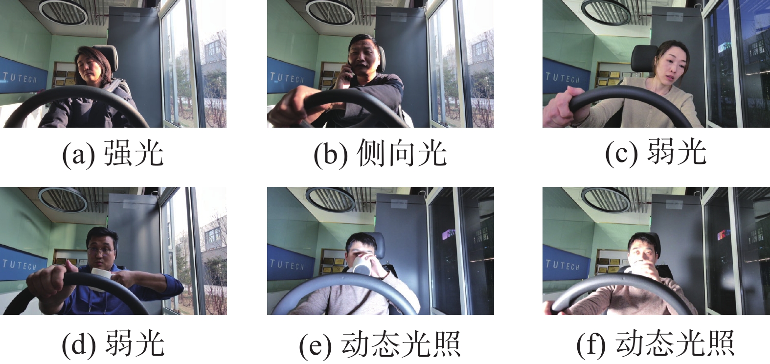 帧数0:喝水&系安全带 174 29 621 33 5 129 10 1 747 1:喝水&不系安全带 167 27 346 35 6 001 10 2 139 2:玩手机&系安全带 163 43 189 32 7 287 11 2 406 3:玩手机&不系安全带 164 39 200 35 10 047 11 2 467 4:吸烟&系安全带 174 32 382 38 7 620 11 2 677 5:吸烟&不系安全带 175 31 962 40 7 916 11 2 828 6:疲劳&系安全带 175 30 472 34 5 368 11 2 079 7:疲劳&不系安全带 163 30 752 34 5 907 10 1 926 8:分神&系安全带 177 27 783 35 5 639 11 1 781 9:分神&不系安全带 157 28 229 36 6 660 12 1 962 训练集汇总 1 689 293 153 — — — — 验证集汇总 — — 352 67 574 — — 测试集汇总 — — — — 108 22 012 注:&表示“并且”。 图2(a)表示强光环境的案例,占总样本的42.3%,模拟正午阳光条件;图2(b)表示侧向光照环境的案例,占比23.7%,对应日出日落时段;图2(c)和(d)是弱光环境,占比18.5%,模拟黄昏或阴天条件;图2(e)和(f)则是展现的动态光照变化的案例,占比15.5%,重点模拟隧道出入口等光照突变场景。本数据集在数据同步性、场景多样性方面均达到了较高标准,为驾驶行为分析及建模提供了可靠的数据基础。
