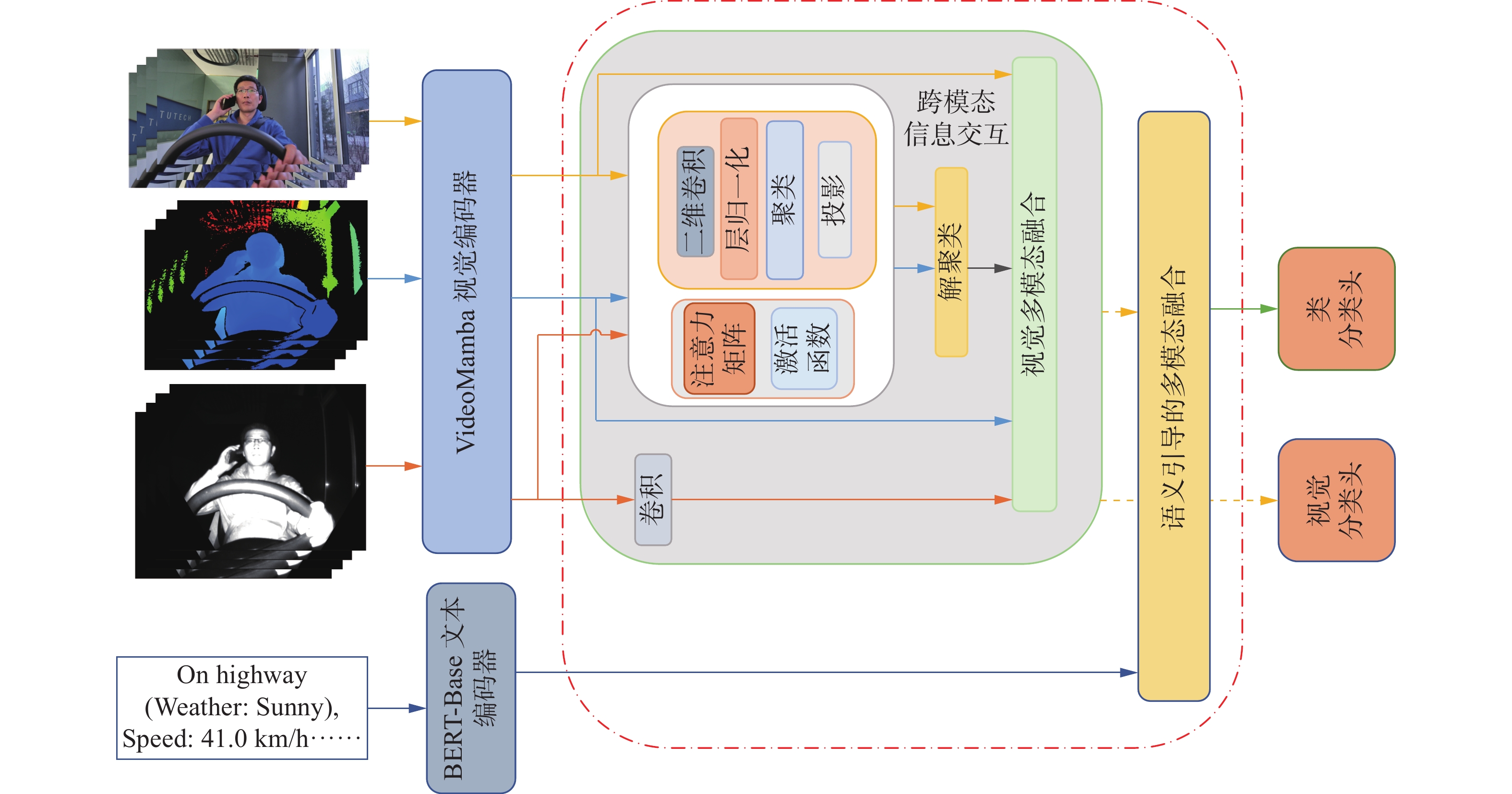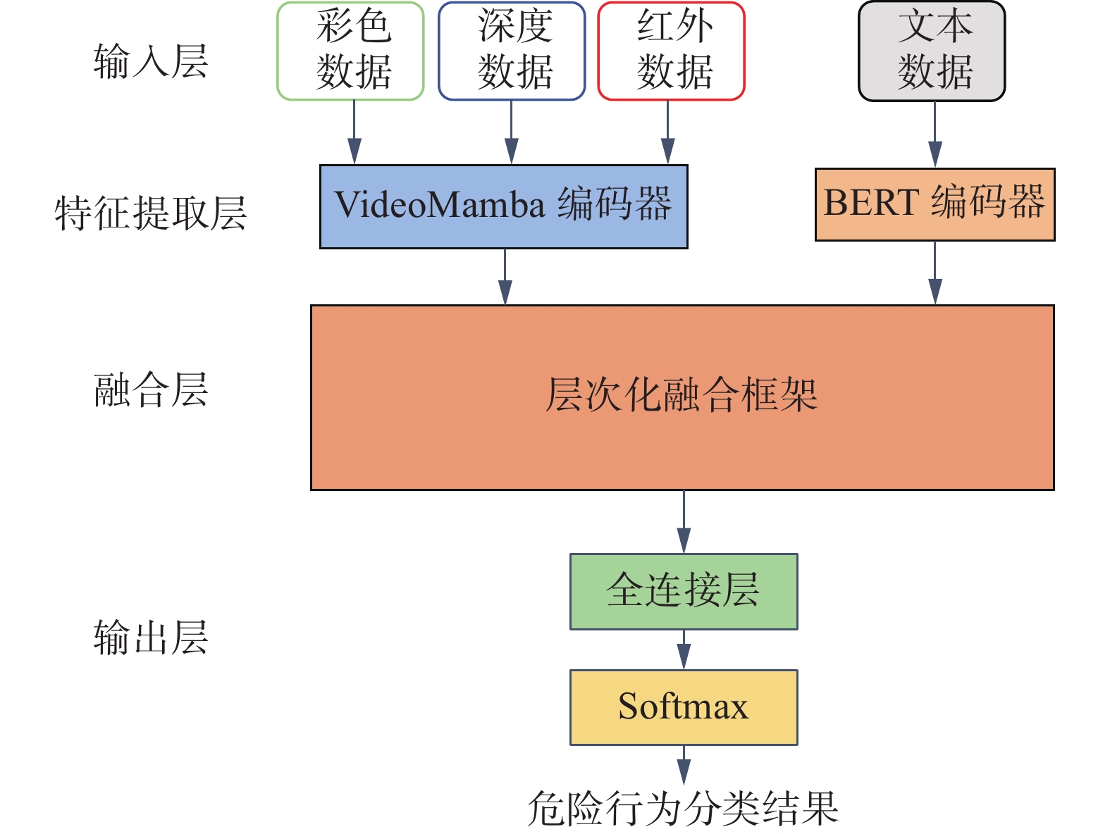 混合模态行为识别任务结合了视觉模态和文本模态的数据,以充分利用不同模态信息的优势,提高行为识别的准确性和鲁棒性。考虑到MSHMD数据集同时提供了彩色、深度、红外3种视觉模态及文本模态数据,所以本文将视觉模态数据表示为:$ \boldsymbol{V}= \left\{{\boldsymbol{V}}_{\text{rgb}} , {\boldsymbol{V}}_{\text{depth}} , {\boldsymbol{V}}_{\text{ir}}\right\} $,其中$ {\boldsymbol{V}}_{\text{rgb}}=\{\boldsymbol{v}_{{}_{\text{rgb}}}^{1} , \boldsymbol{v}_{{}_{\text{rgb}}}^{2} , \cdots , \boldsymbol{v}_{{}_{\text{rgb}}}^{t}\} $代表彩色视觉模态数据,$ {\boldsymbol{V}}_{\text{depth}} $与$ {\boldsymbol{V}}_{\text{ir}} $的表示方式与单模态任务中的彩色视频数据表达方式相同,分别代表深度视觉模态数据和红外视觉模态数据。文本模态数据表示为:$ \boldsymbol{X}=\{{\boldsymbol{x}}_{1} , {\boldsymbol{x}}_{2} , \cdots , {\boldsymbol{x}}_{M}\} $,其中$ {\boldsymbol{x}}_{i} $表示第$ i $帧图像对应的场景、天气与车辆的速度、加速度、方向盘角度等动态信息,$ M $为视频序列的总帧数,这些信息能够反映行驶过程中的物理特征和操作细节。基于混合模态数据进行危险驾驶行为识别任务的目标是基于上述两大类模态的数据,预测驾驶行为的类别$ {y}_{\text{fuse}}\in {Y} $。本文需要构建一个映射函数$ {f}_{\text{multi}}\text{(}\boldsymbol{V} , \boldsymbol{X}\text{)}\rightarrow Y $,使得模型能够正确分类司机的危险驾驶行为。其中$ {f}_{\text{multi}} $是待学习的混合模态融合网络。该网络需要同时处理视觉模态数据和文本模态数据,通过融合这些模态的信息来实现更准确的行为识别。为完成上述基于混合模态数据的危险驾驶行为识别任务,如图3所示,本文构建了一个能够充分挖掘并融合多源异构信息的分类模型。首先,在视觉层面,利用VideoMamba编码器分别提取彩色、深度和红外3种视觉模态特征,其中,彩色模态负责捕捉驾驶员的面部表情、手势、身体姿态等细粒度动作特征;深度模态用于提供驾驶员肢体与方向盘等车内部件的空间距离信息;红外模态则确保在光照变化等复杂环境下,仍能稳定捕捉驾驶员的特征。其次,在语义层面,通过BERT(bidirectional encoder representations from Transformers)对文本数据的编码引入车辆状态和场景描述等先验信息,为视觉感知提供关键的上下文语义引导,使模型能结合具体场景更精准地判断司机的危险行为。最后,通过层次化的混合融合框架,模型实现了多源信息的互补与增强,最终可输出准确的危险驾驶行为分类结果。层次化融合框架将在下一小节具体介绍。