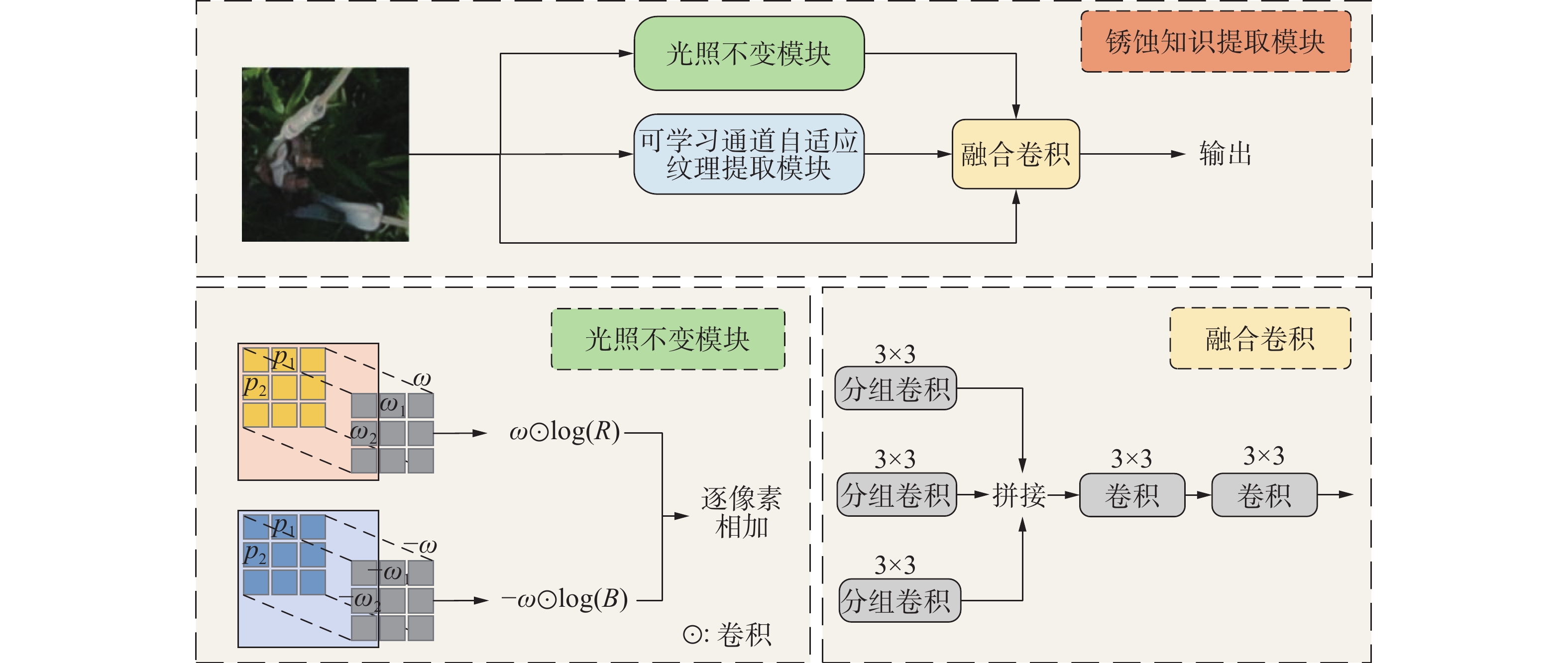 如图2所示,针对配电线路金具在光照不均条件下锈蚀难判别问题,本模块通过光照不变模块[14]构建颜色恒常性特征空间,可学习通道自适应纹理提取模块建立方向敏感特征表达,再通过融合卷积与原图结合,实现锈蚀特征一致性表达。该模块可以与现有检测模型集成,增强网络在复杂环境下的能力。