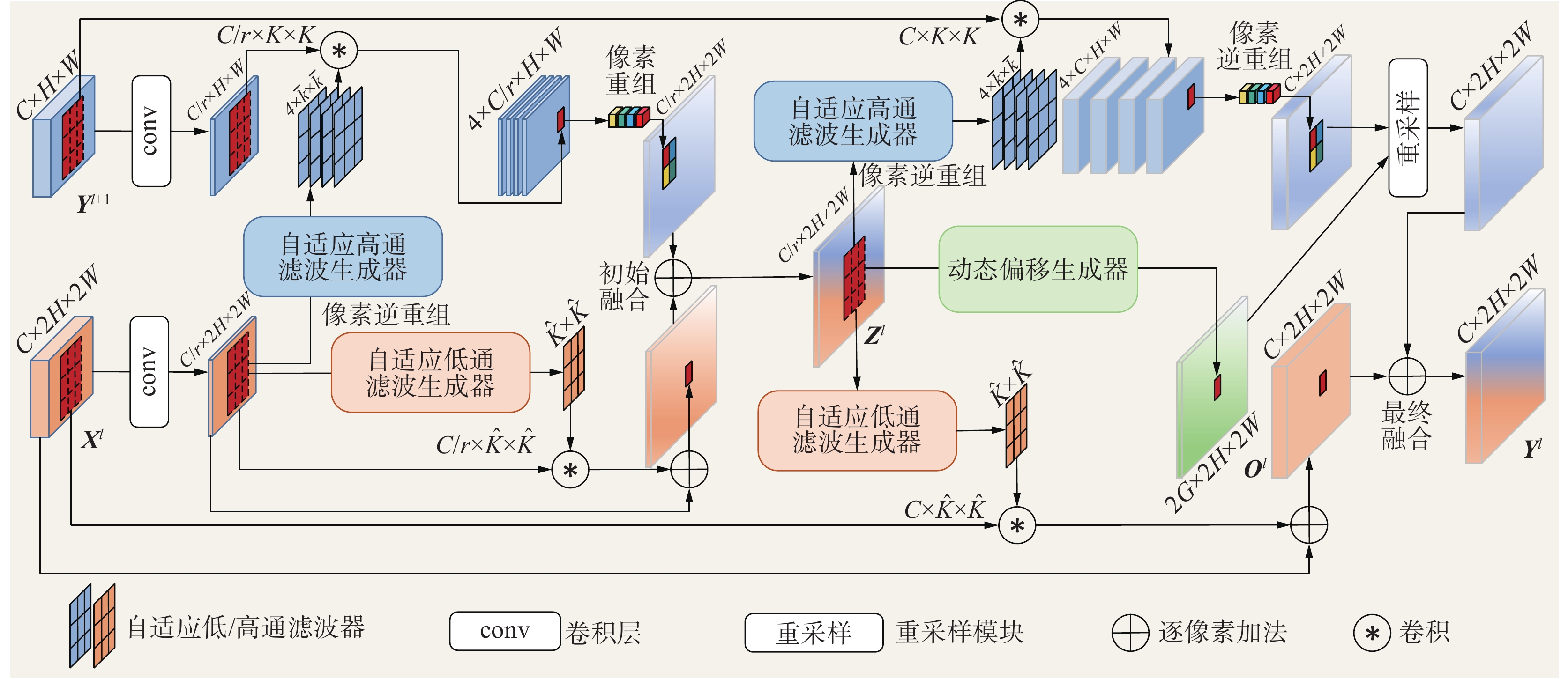 特征融合流程包含3个阶段:首先对高层特征$ {\boldsymbol{Y}}^{l+1} $和低层特征$ {\boldsymbol{X}}^{l} $进行通道压缩生成共享特征$ {\boldsymbol{Z}}^{l} $;随后自适应低通滤波生成器生成平滑上采样特征,动态偏移生成器执行特征重采样优化;同时自适应高通滤波生成器增强低层特征的高频细节;最终将优化后的高层特征与增强的低层特征逐元素融合。该方法在保持特征金字塔多尺度优势的同时,通过频域自适应机制显著提升特征一致性。