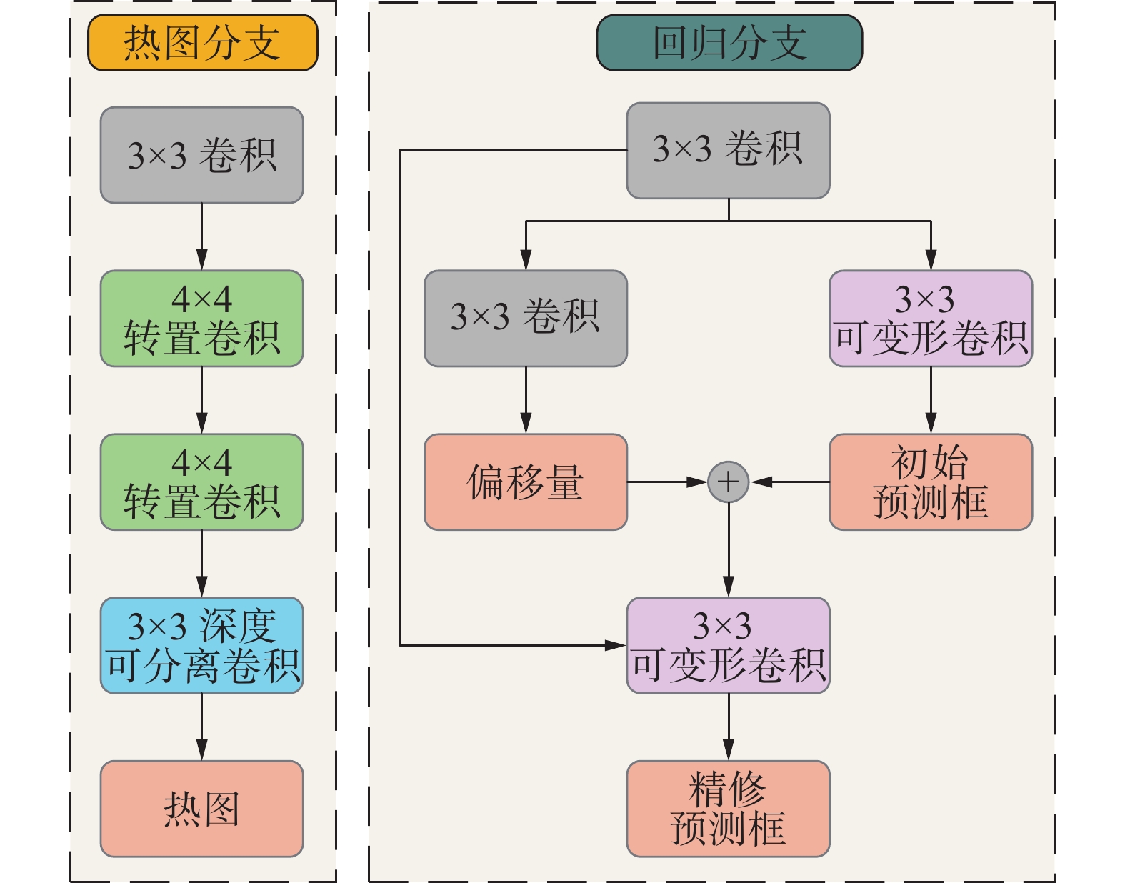 $$ {\boldsymbol{B}}_{\text{init}}=\{({x}_{i},{y}_{i},{w}_{i},{h}_{i})\}_{i=1}^{N}={\text{Regress}}_{1}(\boldsymbol{F}) $$ 式中:$ ({x}_{i},{y}_{i}) $表示边界框中心坐标,$ ({w}_{i},{h}_{i}) $表示宽高,$ N $为预测框数量。首级输出提供几何先验,用于引导次级网络的偏移量预测。