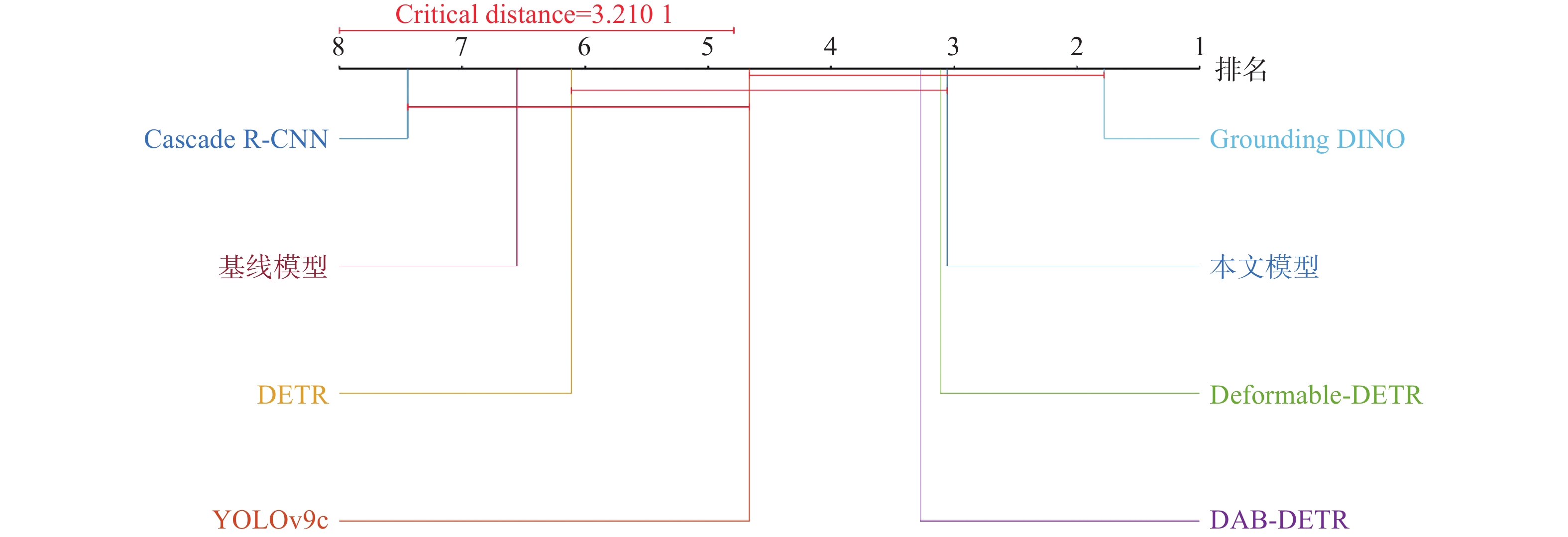 在同类先进模型对比中,本文模型以3.056的平均秩超越Deformable-DETR和DAB-DETR,尽管秩差小于临界差阈值,但排名顺序揭示了其相对优势。本文模型与YOLOv9c的秩差达1.611,接近临界差值的50.2%,表明粗−精双阶段检测框架较单阶段设计在电力场景中具有更优的统计稳定性。检验结果进一步表明,本文模型是唯一进入第一性能层级的非Transformer架构算法,实现了传统卷积神经网络(convolutional neural network, CNN)架构的性能突破。