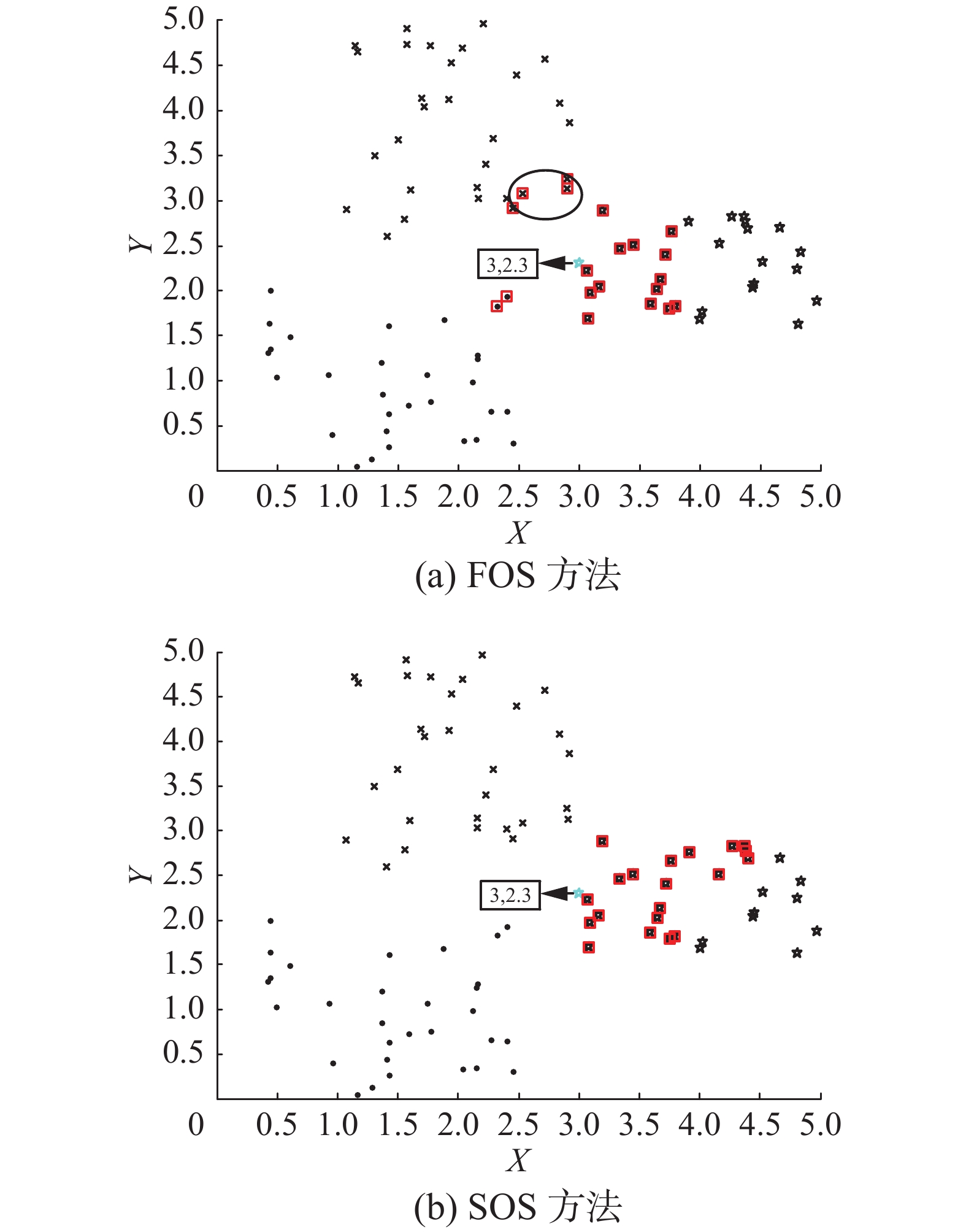 采用二维空间中的数值仿真,进一步探讨FOS、SOS准则的区别及特点。图2为二维空间中以3个类别中心随机产生的三类数据集。对于“星型”标记类上一点(3,2.3),图3(a)、(b)中正方形标记框标记的样本分别是通过FOS与SOS准则选择到的,与FOS准则相比,SOS准则选择到的相似数据全是同类数据集,这是由于SOS准则在选择相似数据时不仅考虑数据单点间的相似性,而且充分考虑了数据集总体分布特征。选择同类别数据建立的局部模型更合理,精度更高。