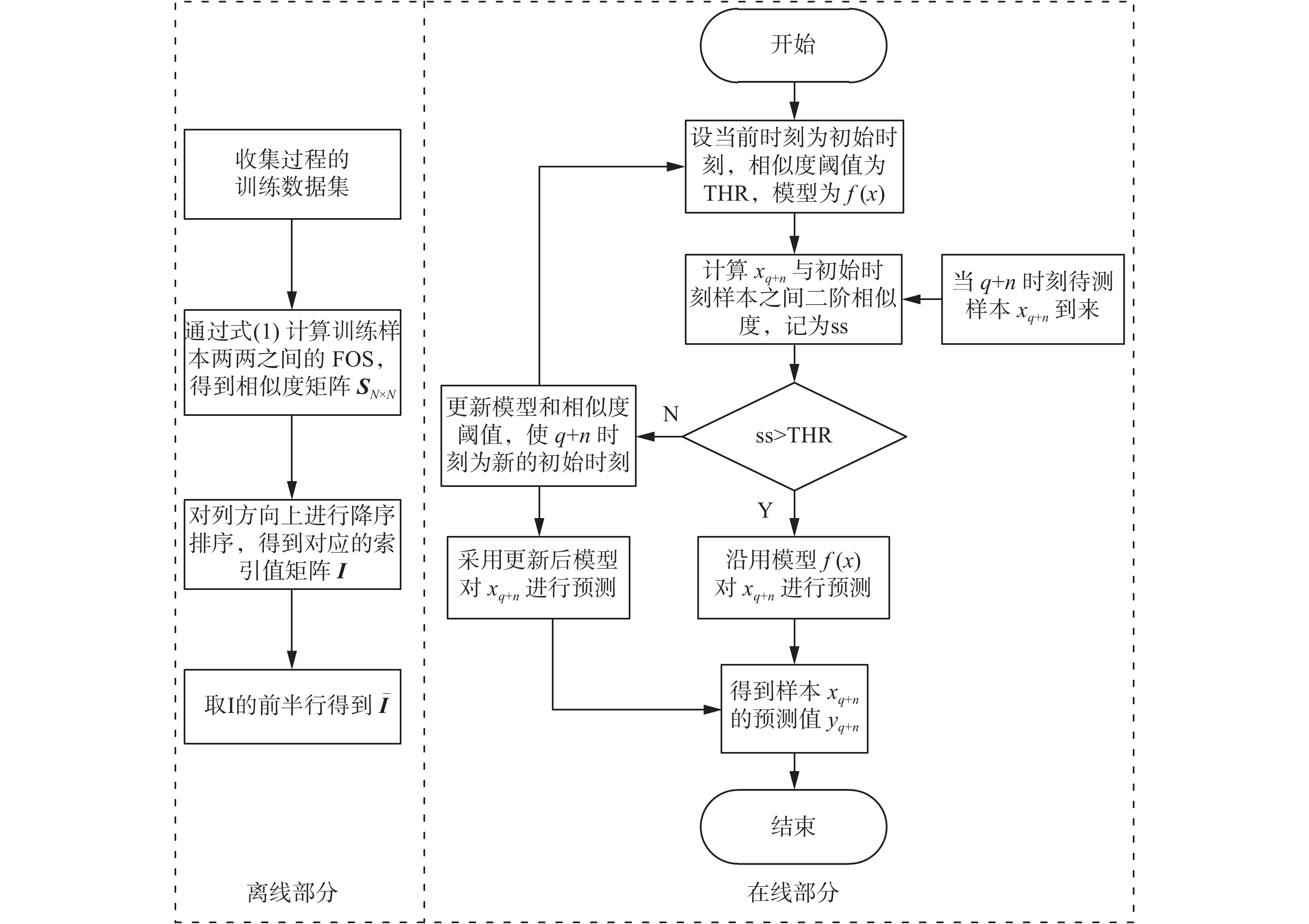 针对某些工况容易随时间发生变化的工业过程,传统的全局软测量模型难以满足工业过程的实时性要求且外推能力差[4],比较普遍的一种解决方案是采用即时学习[5-6](just-in-time learning,JITL)策略,对于JITL相似度准则这一核心,学者们做出了大量的研究。Chen等[7]考虑到常见的相似度准则仅将样本的输入信息联系起来,没有综合样本的输出信息,因此其把输入和输出信息共同考虑构造自适应加权距离作为相似度指标;Niu等[8]结合模糊C-均值和传统的JITL这两种方法,首先采用模糊C-均值方法重构收集的历史样本,然后采用JITL方法在重构的历史样本集中选取当前的局部相似样本建立软测量模型。然而,该类方法没有考虑到JITL的耗时问题,在一些实时性要求较高的工业过程中无法有效运用。