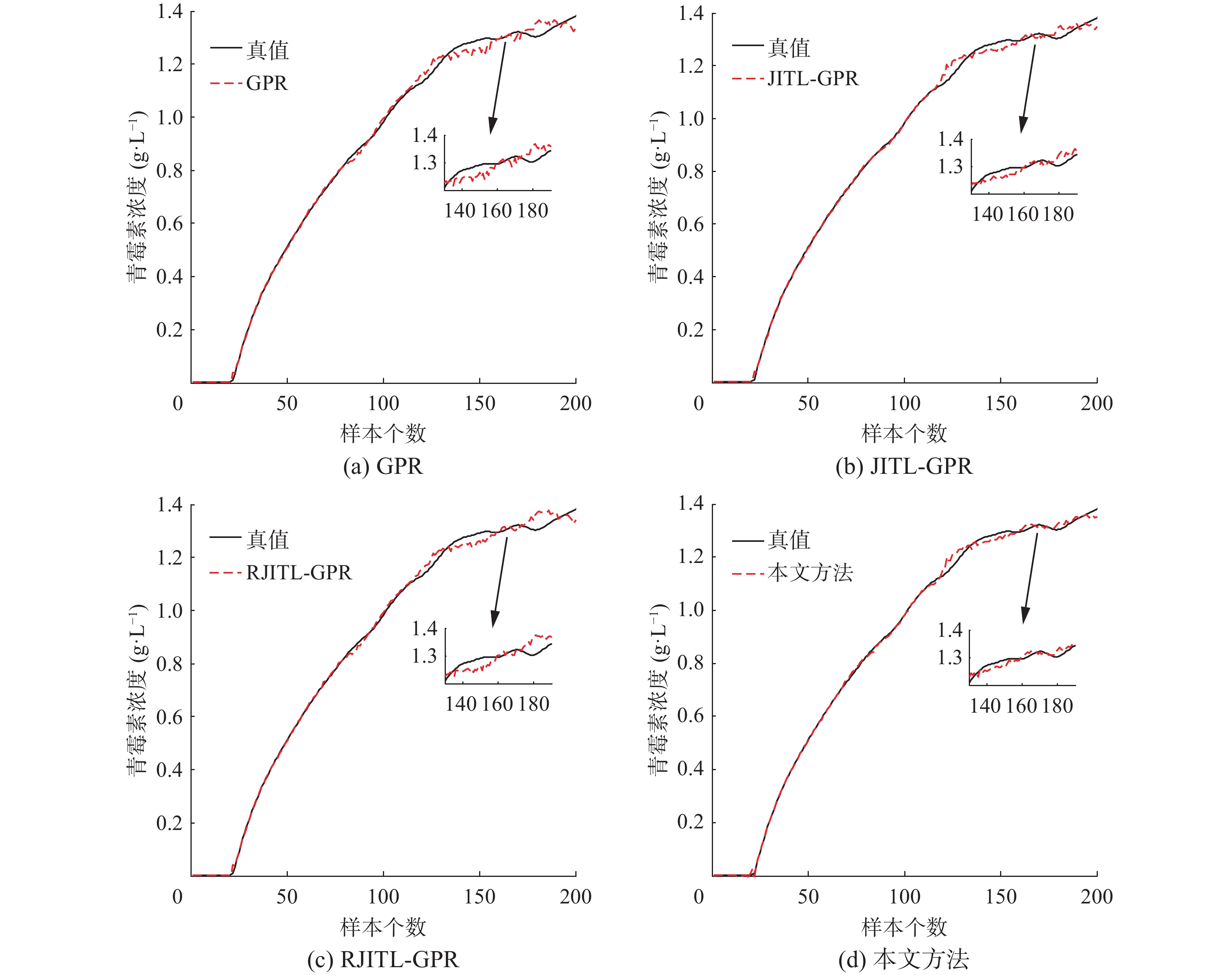 青霉素产生菌在适当的温度、pH值等外部环境条件下生长与抗生素合成这一过程称为青霉素发酵过程,此过程分为3个阶段,即产生菌生长阶段、青霉素合成阶段与产生菌的自溶阶段[19]。作为模拟青霉素发酵过程的Pensim仿真平台,其包含了众多的输入变量与输出变量,其中青霉素这一重要产物的浓度在实际发酵过程中难以测得,因此可以采用软测量建模进行在线预测。本文采用通气速率、CO2浓度和pH值等6个变量作为输入变量,青霉素浓度作为输出变量,建立软测量模型。采用Pensim仿真平台产生400组样本,选取其中200组作为训练数据,剩余的作为测试数据来验证所提方法。