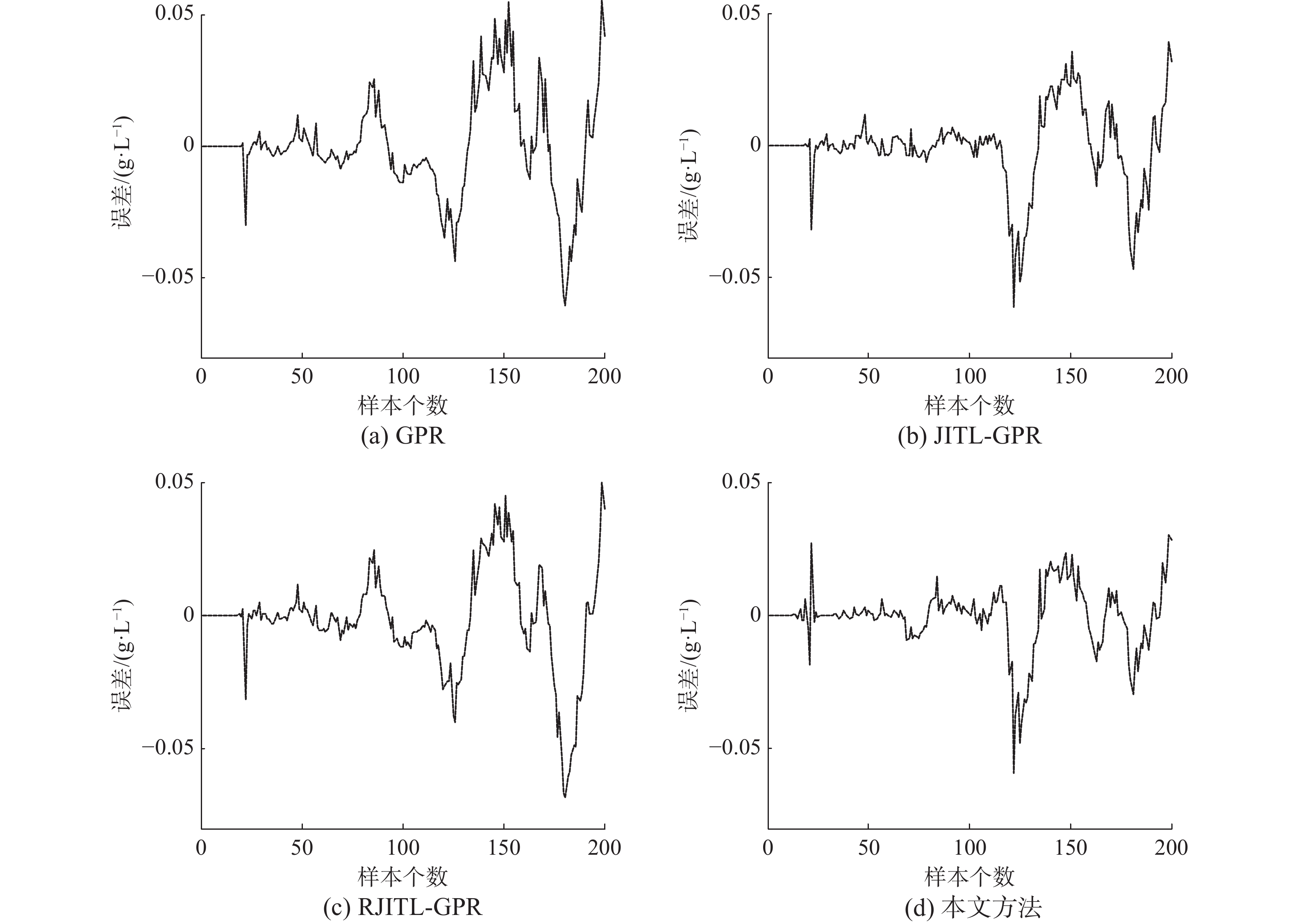 为了验证本文所提方法的预测性能,分别选取GPR方法、一阶相似度的GPR方法(简写为JITL-GPR)、减少模型耗时的一阶相似度GPR方法(简写为RJITL-GPR)3种方法与本文方法(proposed)对比,且JITL在选取局部相似样本数目时均采用累积相似度因子。4种方法预测曲线如图6所示,将样本130~190的预测曲线进行放大,可以直观的看出,与前3种方法相比,所提方法的跟踪性能更好。4种方法的预测误差如图7所示,其中,图7(d)中的误差曲线在0处抖动幅度更小,表明该方的预测精度更高。